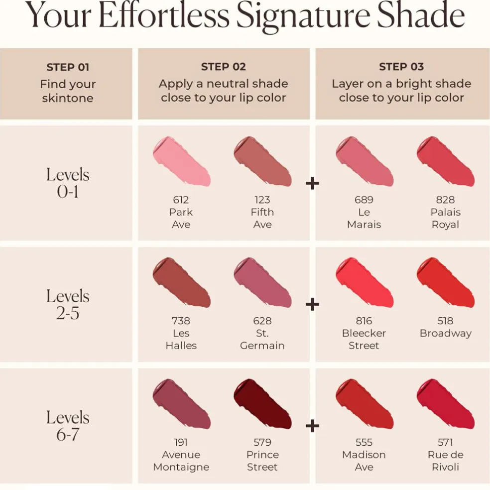 Vælg mellem 12 smukke nuancer, der kan genopfyldes, fra hverdagsnuancer, pink og brun til dristige røde og koralfarvede nuancer til alle lejligheder og hudtoner.