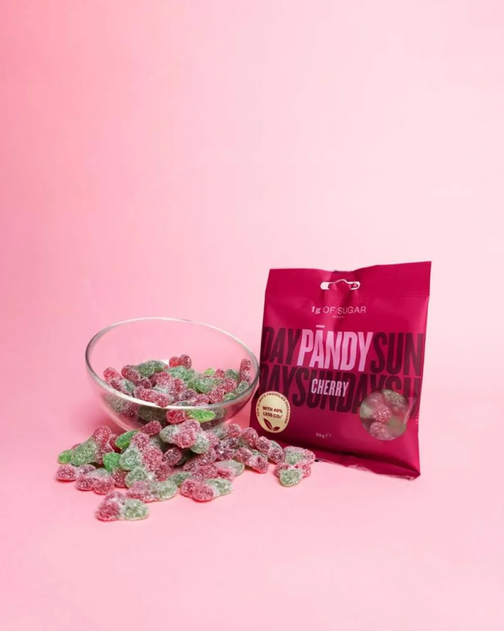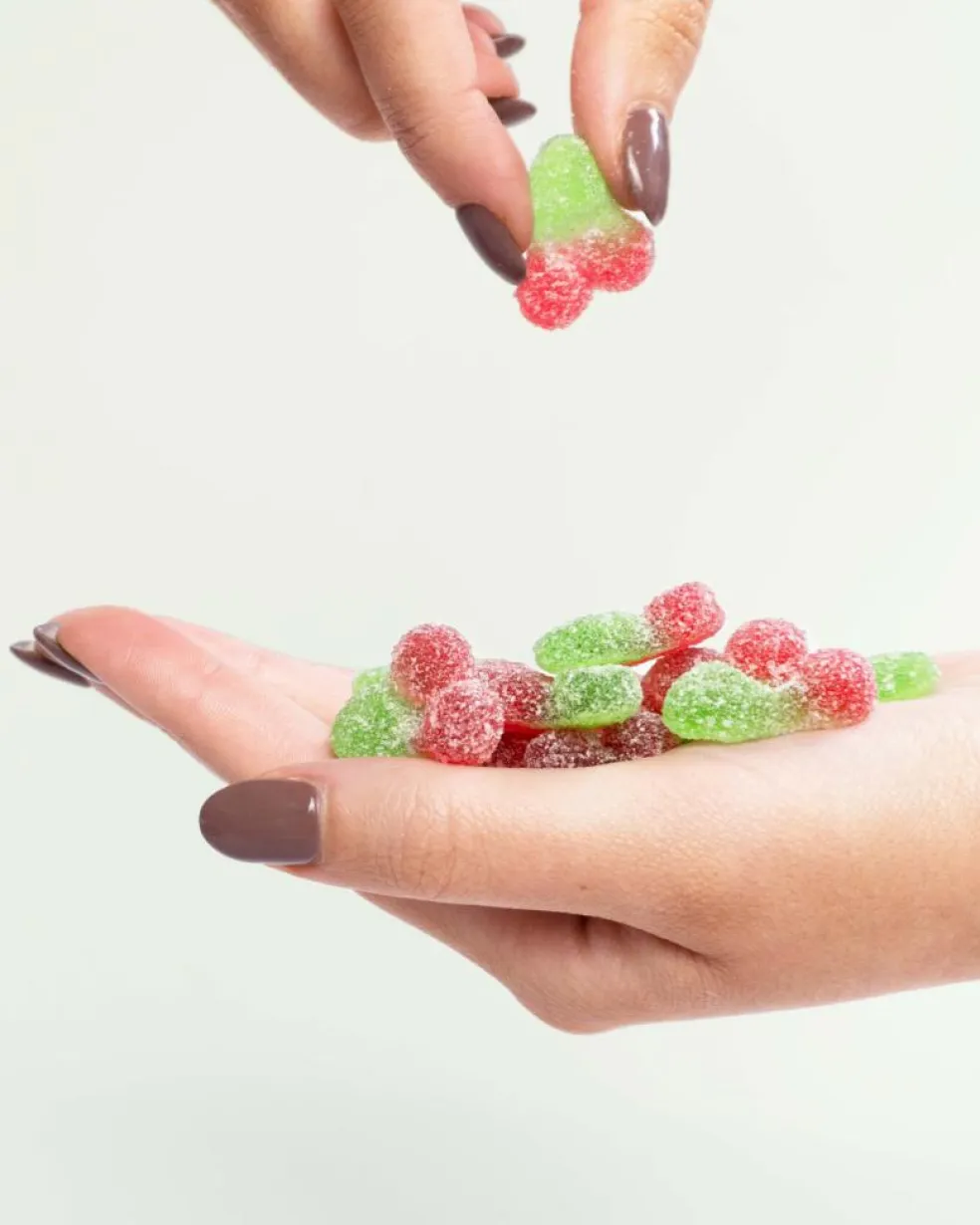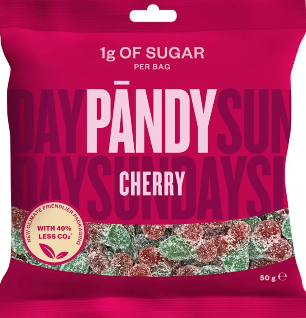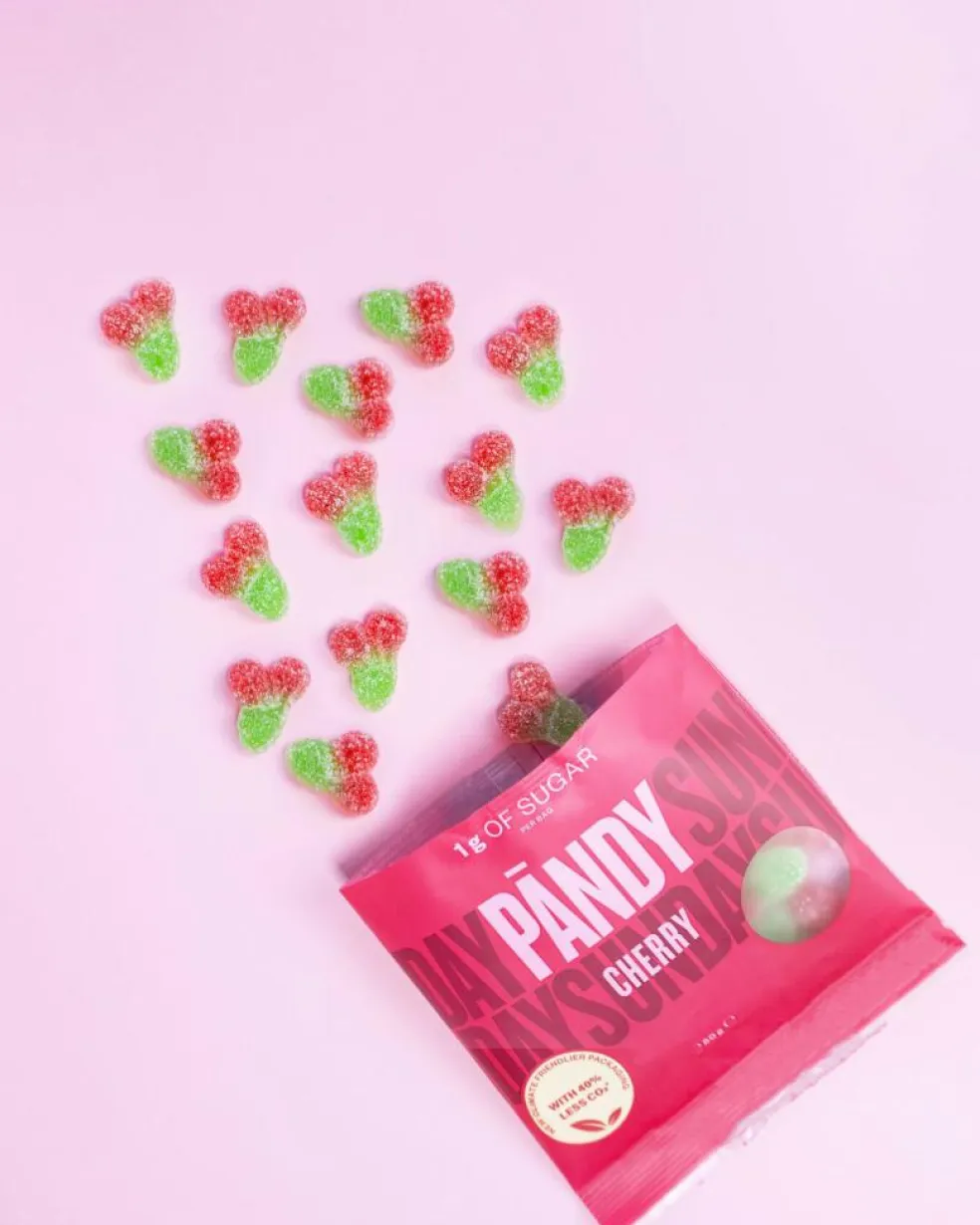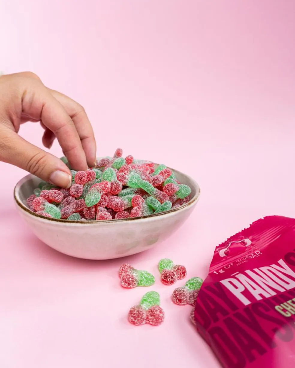 Syrlig vingummi med kirsebærsmag uden tilsat sukker.