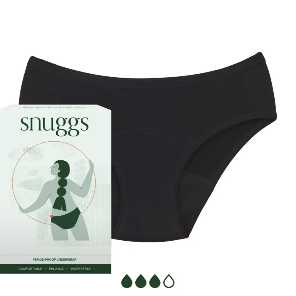 Menstruationstrusser snuggs kan bruges alene eller som supplement til tamponer og kopper. De har en integreret 3-lags tekstilteknologi i skridtet, som leder fugt væk fra huden, absorberer den og forhindrer lækage.