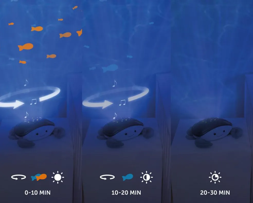 Havprojektoren har også et valgfrit søvnprogram i tre trin, som hjælper dit barn med at falde i søvn.