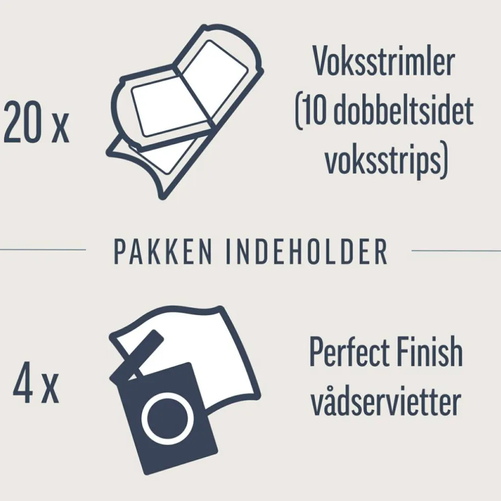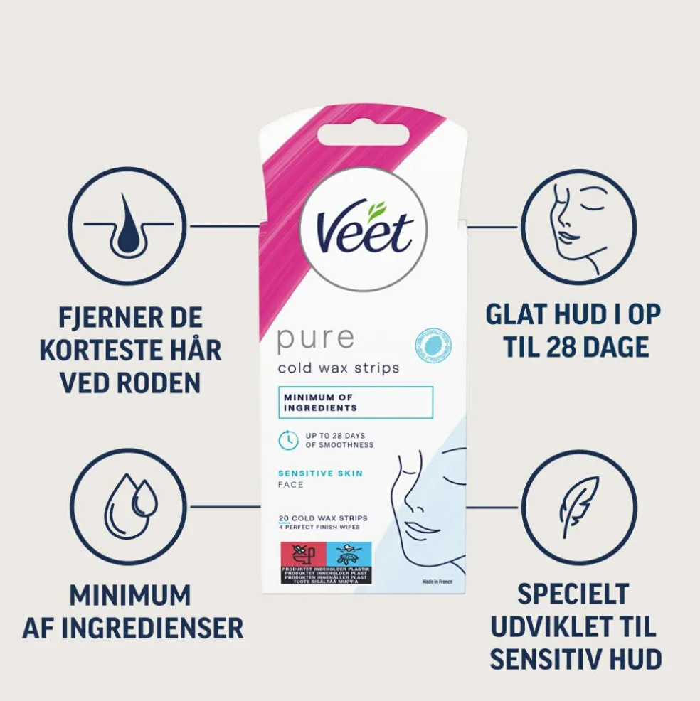 De er designet til sensitiv hud. Indeholder 20 cold wax strips til ansigt