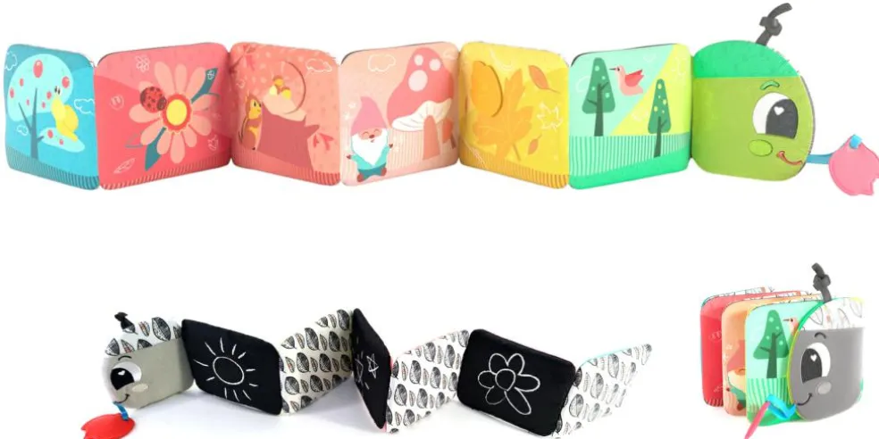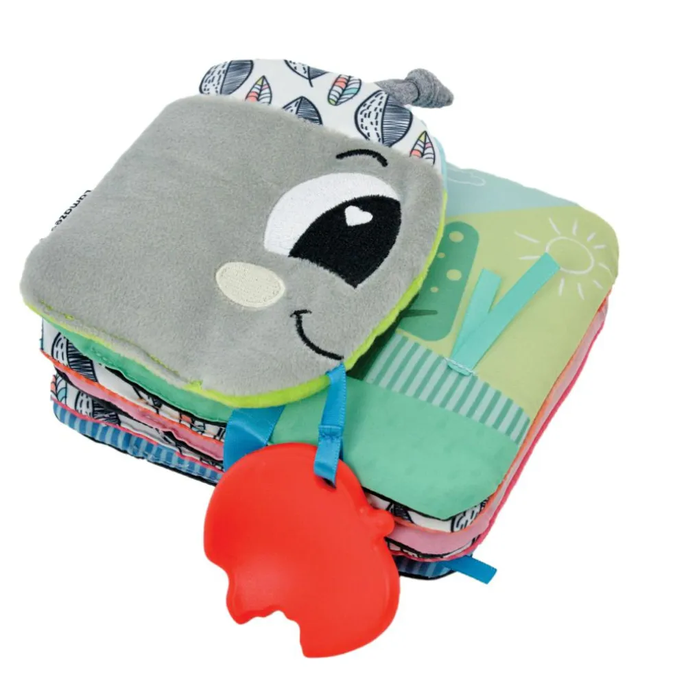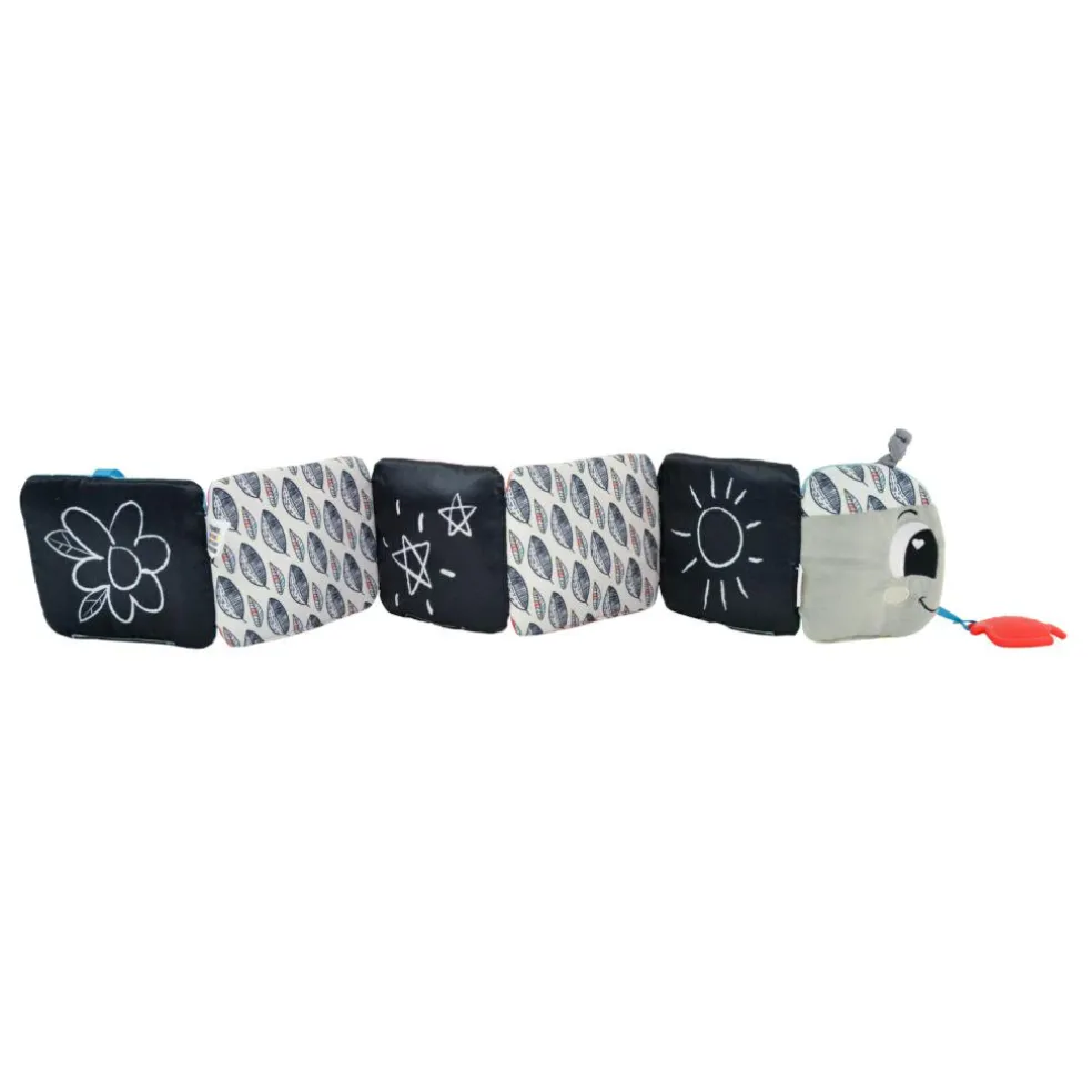 På den ene side er der masser af klare farver, sjove billeder og spændende ting at undersøge – som en skjult pivelyd, bløde stofteksturer og sjove knitrelyde. Vend den om, og find rolige sort-hvide mønstre, der hjælper baby med at fokusere.