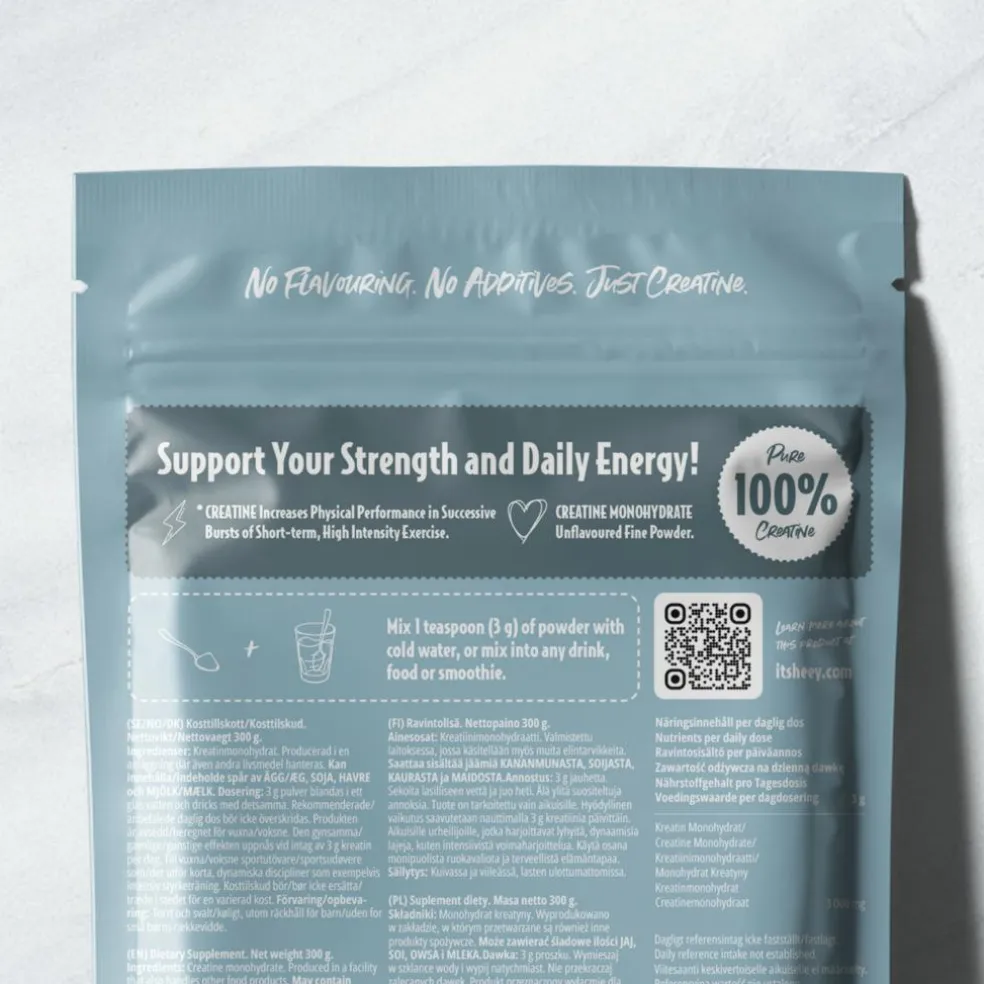 Hver portion indeholder 3 g kreatinmonohydrat af høj kvalitet. Rent, enkelt & vegansk. Ingen smagsstoffer. Ingen fyldemidler. Ingen tilsætningsstoffer. Kun rent kreatinmonohydrat. 100% vegansk og nem at blande i vand, smoothies eller mad.