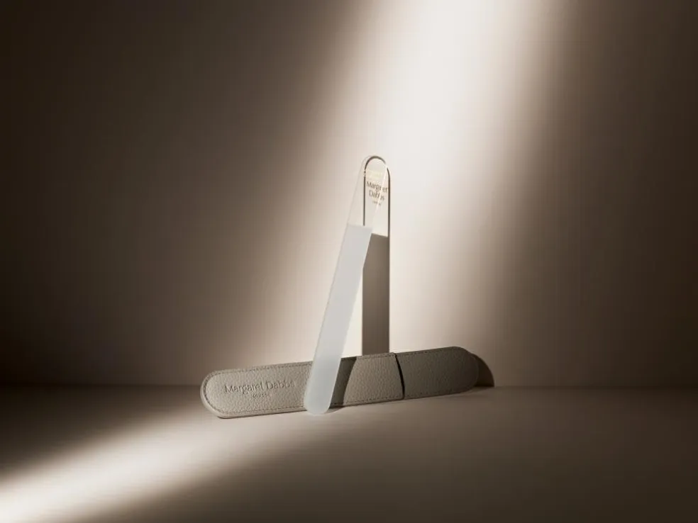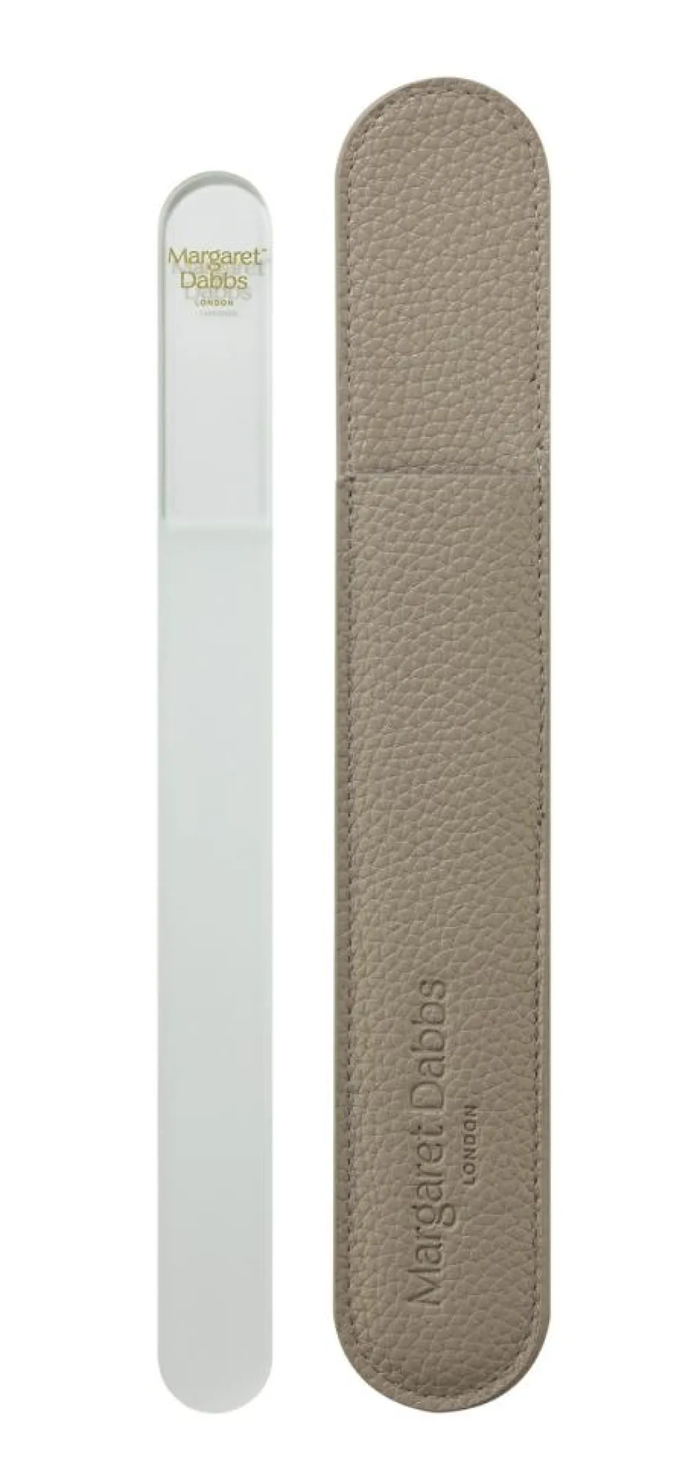 Beskyt din Margaret Dabbs® London Crystal-neglefil med stil med vores luksuriøse cover til neglefilen i taupe, vegansk læder.