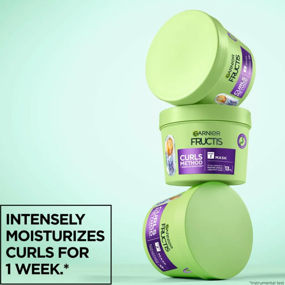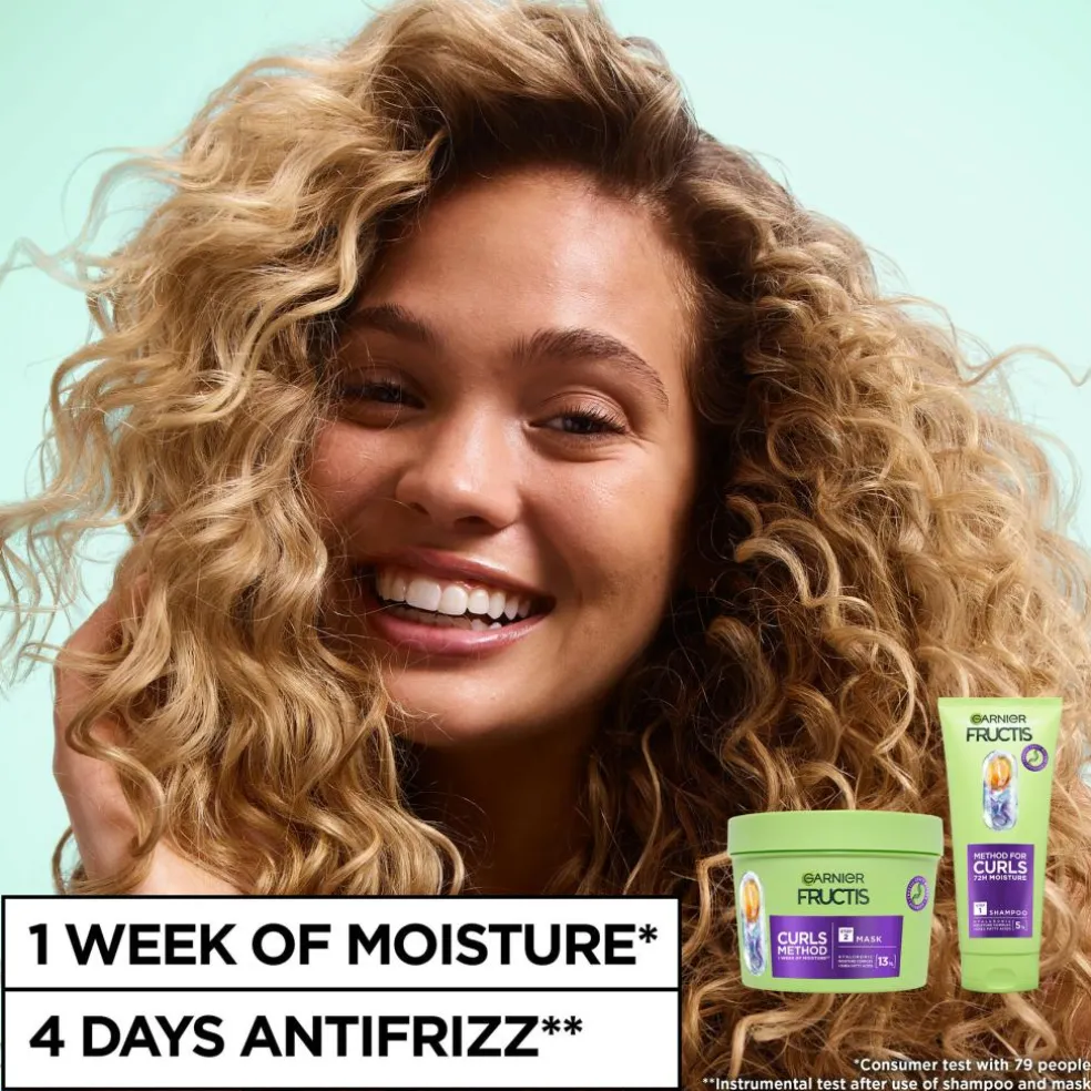 Fuldfør rutinen med Fructis Method for Curls N°0 fugtgivende pre-shampoo, n°1 nænsomt rensende shampoo og n°3 opfriskende spray.