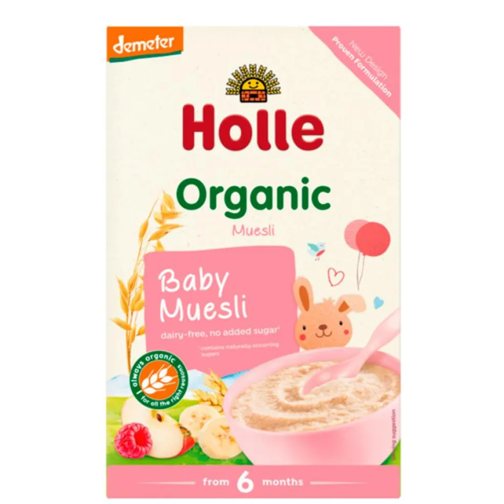 Økologisk fuldkorns müesligrød til babyer fra 6 måneders alderen. Grøden er lavet med fuldkorn af hvede, ris, havre, æble, banan og hindbær, som smager godt og er let at fordøje.