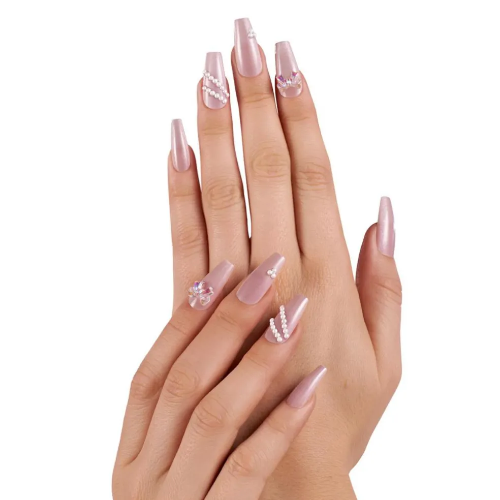 Du kan vælge mellem at sætte de kunstige negle på med den medfølgende lim eller med de medfølgende tabs (dobbeltklæbende negletape), hvis du ønsker en endnu smidigere løsning.