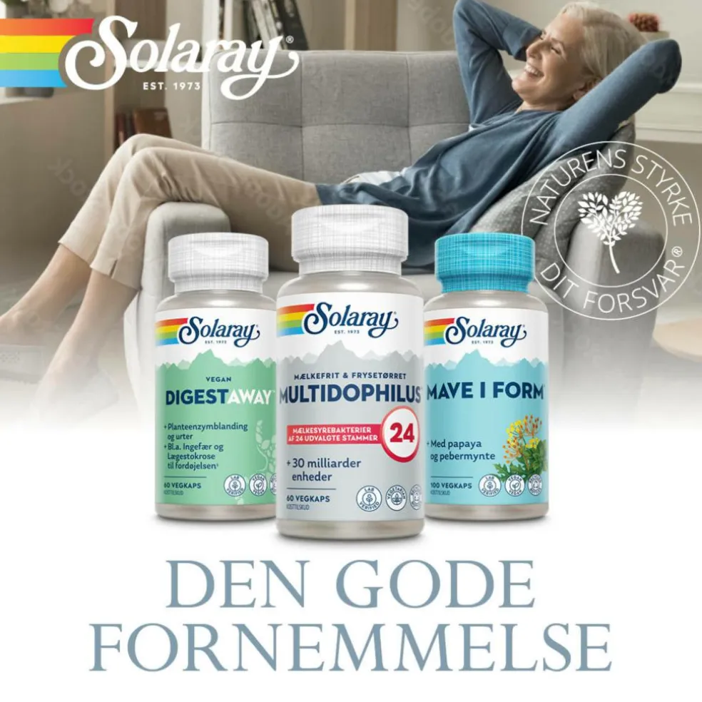 Ingefær, rod (Zingiber officinale, Roscoe): 35 mg, Papaya, blad (Carica papaya L.): 35 mg, Elm, bark (Ulmus rubra, Muhl.): 30 mg,