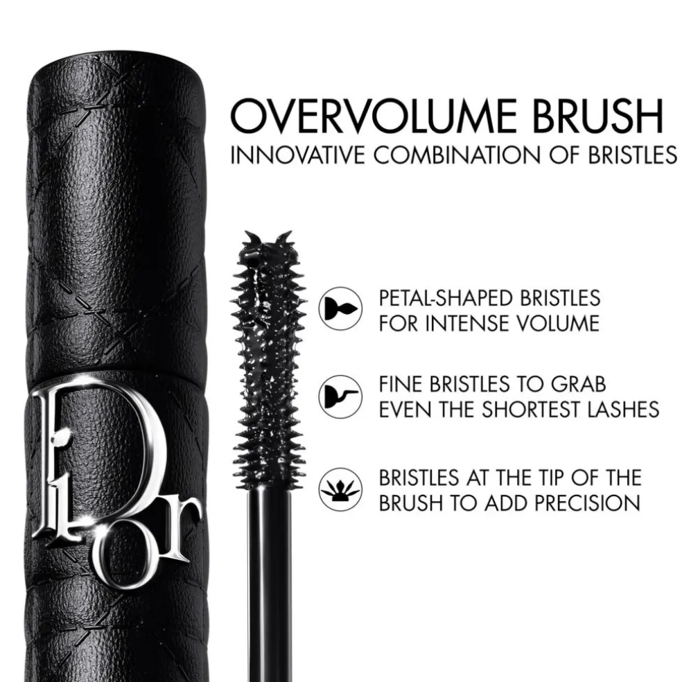 Diorshow Overvolume: Mascaraen, der kombinerer ekstrem volumen og definition vippe for vippe. Denne mascara giver øjeblikkeligt 440 %* mere volumen kombineret med mere definition vippe for vippe med et vifteformet look som resultat. Den er intenst pigmenteret og dækker vipperne med en dyb sort farve, der ikke smitter af og holder i 24 timer.* Etuiet til denne Dior-mascara er udsmykket med cannage, husets ikoniske couturesymbol.