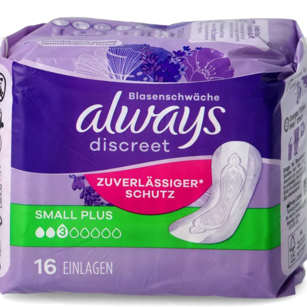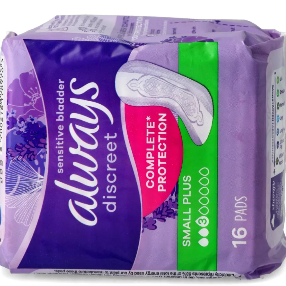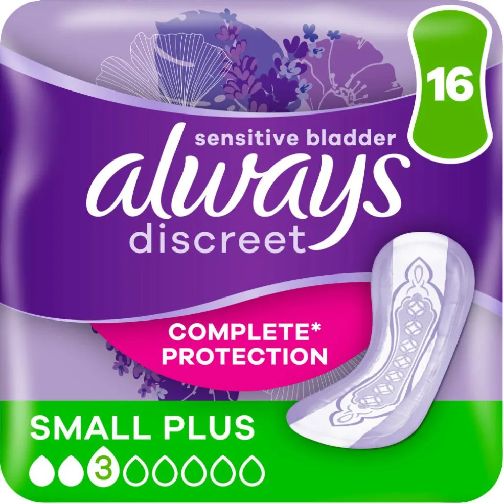 Always Discreet inkontinensbind Small Plus giver dig komplet* beskyttelse og en diskret pasform. Bindene er designet til at give dig pålidelig beskyttelse mod lækage, lugtkontrol, omgående tørring, blød og nænsom fornemmelse, samtidig med at de passer til din krop. Hvis nys eller latter får blæren til at lække, giver Always Discreet Bind Small Plus en stærk beskyttelse og den diskretion, du ønsker, så du kan føle dig tryg
