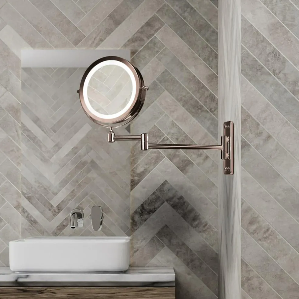 Selve spejl hovedet er 17,5 cm i diameter. Nem rengøring med sprit og fugtig klud.