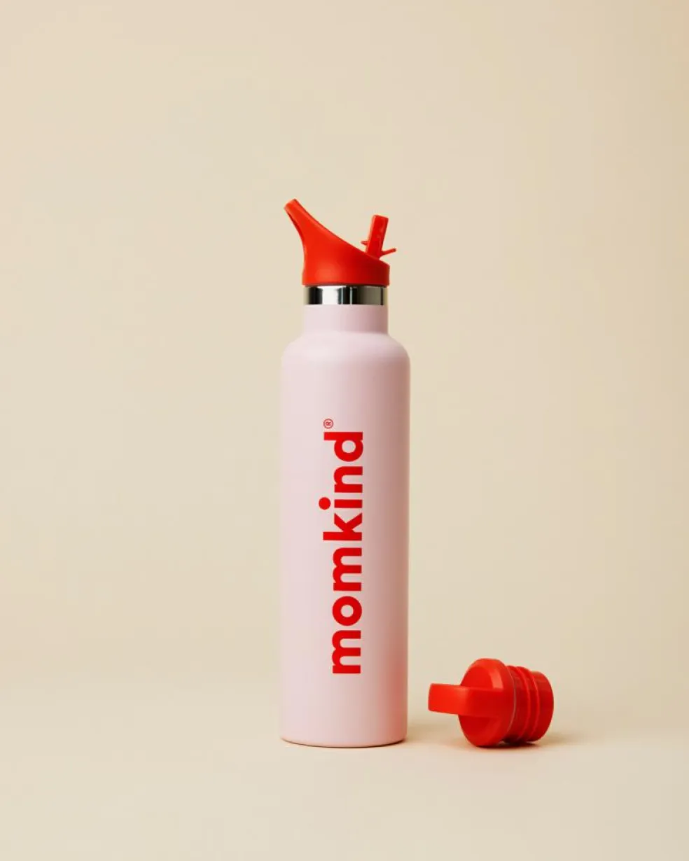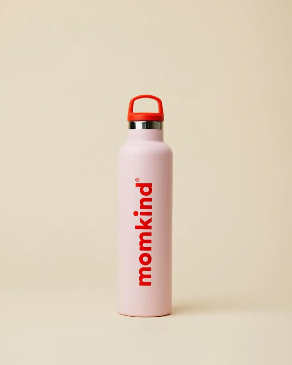 Du får din nye momkind drikkedunk i en flot snørepose med lyserødt logo.