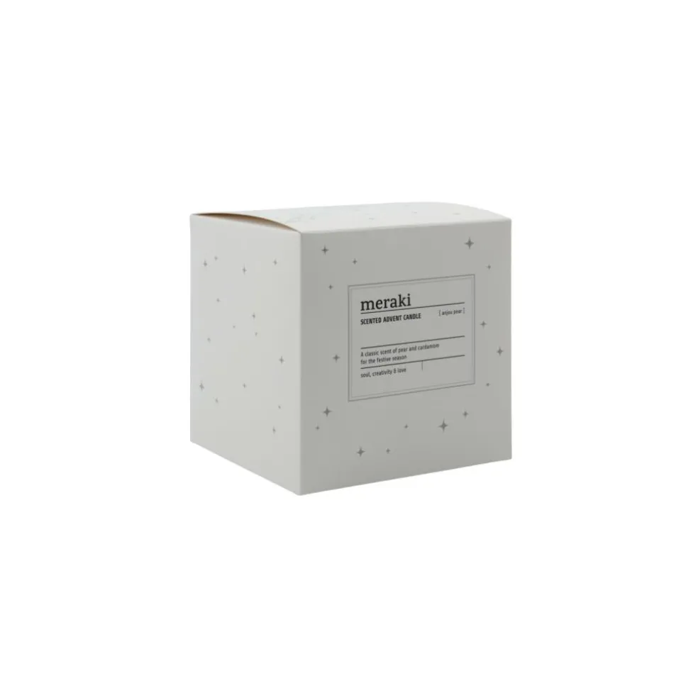 Find roen med dette adventsduftlys fra Meraki. Den klassiske duft af pære og kardemomme sætter den rette stemning til selvforkælelse eller en stund i sofaen med en kop te. Lige hvad du trænger til efter en dag fyldt med juleindkøb og andre gøremål. Fordi lyset er stort, har det 3 væger, som får det til at brænde mere ensartet og giver en stærkere glød end mindre lys. Nyd selv lyset eller overrask en, du holder af, med en betænksom og afstressende gave, der kan bruges hele december.