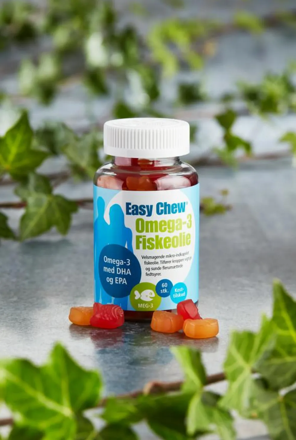 EasyChew® Omega-3 er velsmagende gummies, med form som fisk, der smager dejligt af frugt – helt uden bismag. EasyChew® Omega-3 indeholder den patenterede og mikro-indkapslede MEG-3® Omega-3 fiskeolie, som ikke harskner.