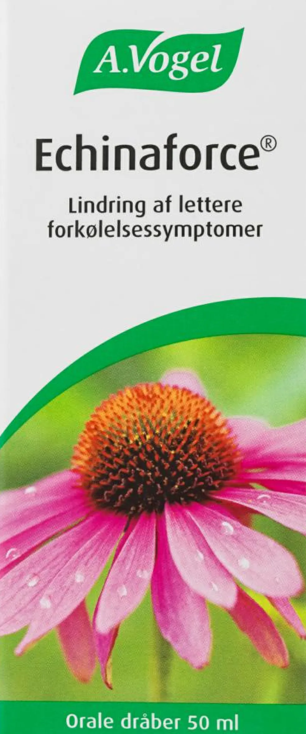Echinaforce® Orale dråber (udtræk af Purpur solhat), pakningsstørrelser 50 ml / 100 ml / 2×100 ml. Læs omhyggeligt indlægssedlen. Indikationer: Naturlægemiddel til brug ved lindring af lettere forkølelses- symptomer. Styrker kroppens immunforsvar og øger derved modstandskraften overfor forkølelse. Do- sering: Voksne: 30 dråber i et glas vand 3-5 gange daglig i højst 8 uger. Må kun efter aftale med læge anvendes til gravide, ammende eller børn under 12 år. Særlige advarsler og forsigtighedsregler inden brugen: Bør ikke bruges sammenhængende i mere end 8 uger af gangen. Kontakt læge ved forvær- ring af symptomer eller høj feber. Allergiske patienter skal kontakte lægen inden brug. Præparatet indeholder ethanol (65% Vol.) og må derfor ikke anvendes, hvis du er i behandling med disulfiram (mod alkoholisme) eller metronidazol (mod betændelse). Kontraindikationer: Overfølsomhed over for planter af kurvblomstfamilien (f.eks. krysantemum eller bynke). Tuberkulose, leukæmi, bindevævssygdomme og andre auto- immune sygdomme. Dissemineret sklerose. HIV-infektion, anden immundefekt eller immunosupression. Sygdomme relateret til hvide blodlegemer.Forkortet produktinformation er baseret på produktresumé dateret 20. januar 2020, som kan rekvireres hos A. Vogel Danmark A/S på tlf. 8770 8770 eller www.produktresume.dk15-5-2020/MNI