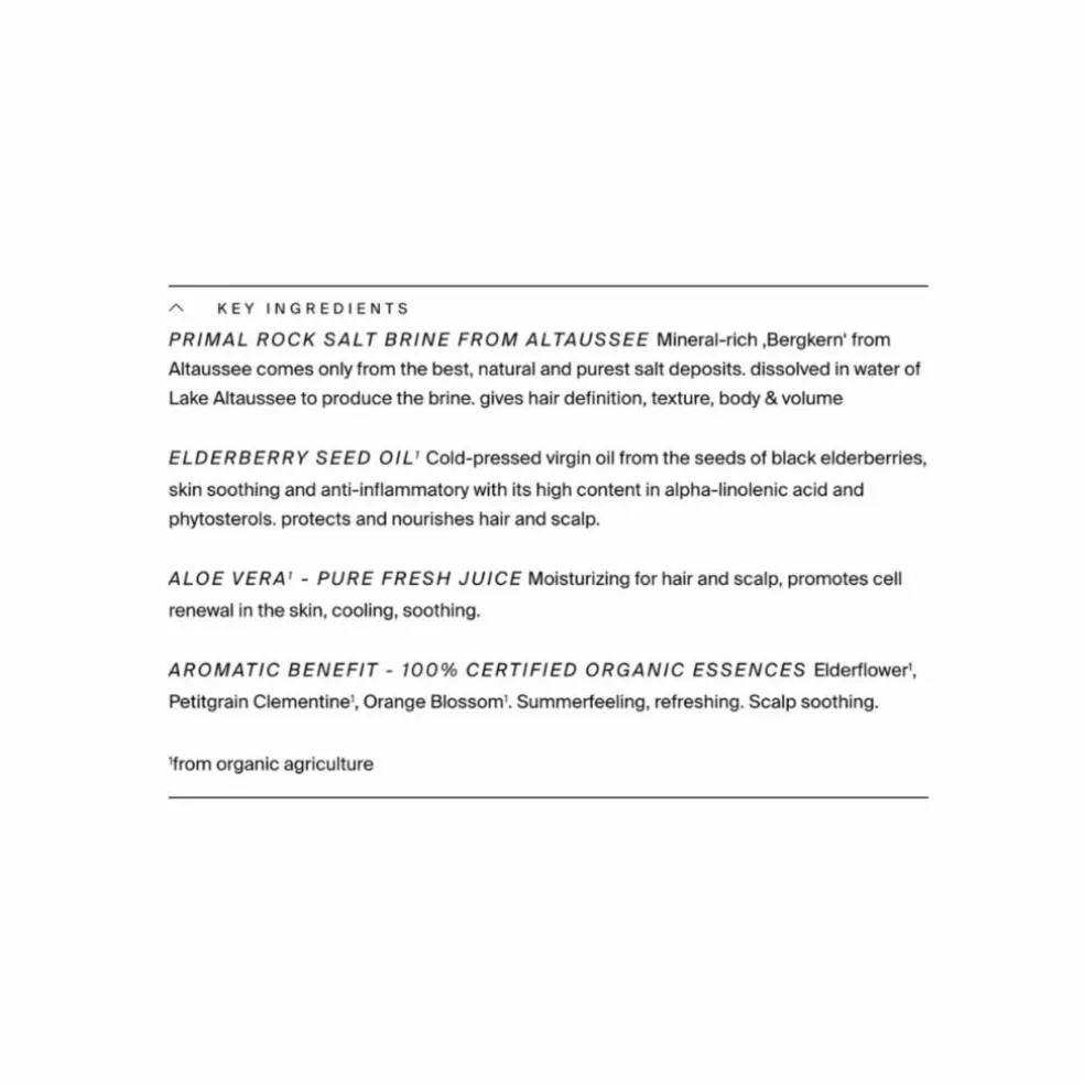 Denne eksklusive og økologiske Elderflower Salt Spray er fugtgivende styling spray som giver struktur, volume og blødt hold med en mat finish. Ideel forberedelse til opsætninger og fletninger.