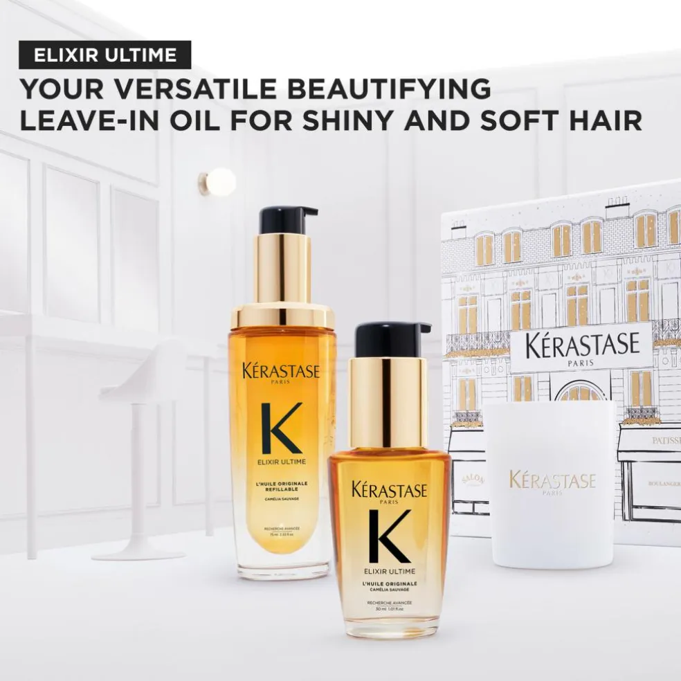 Kérastase Elixir Ultime Duo Holiday Set til mat hår består af to produkter: Elixir Ultime L’Huile Originale Hair Oil 75 ml og en 30 ml travel size.