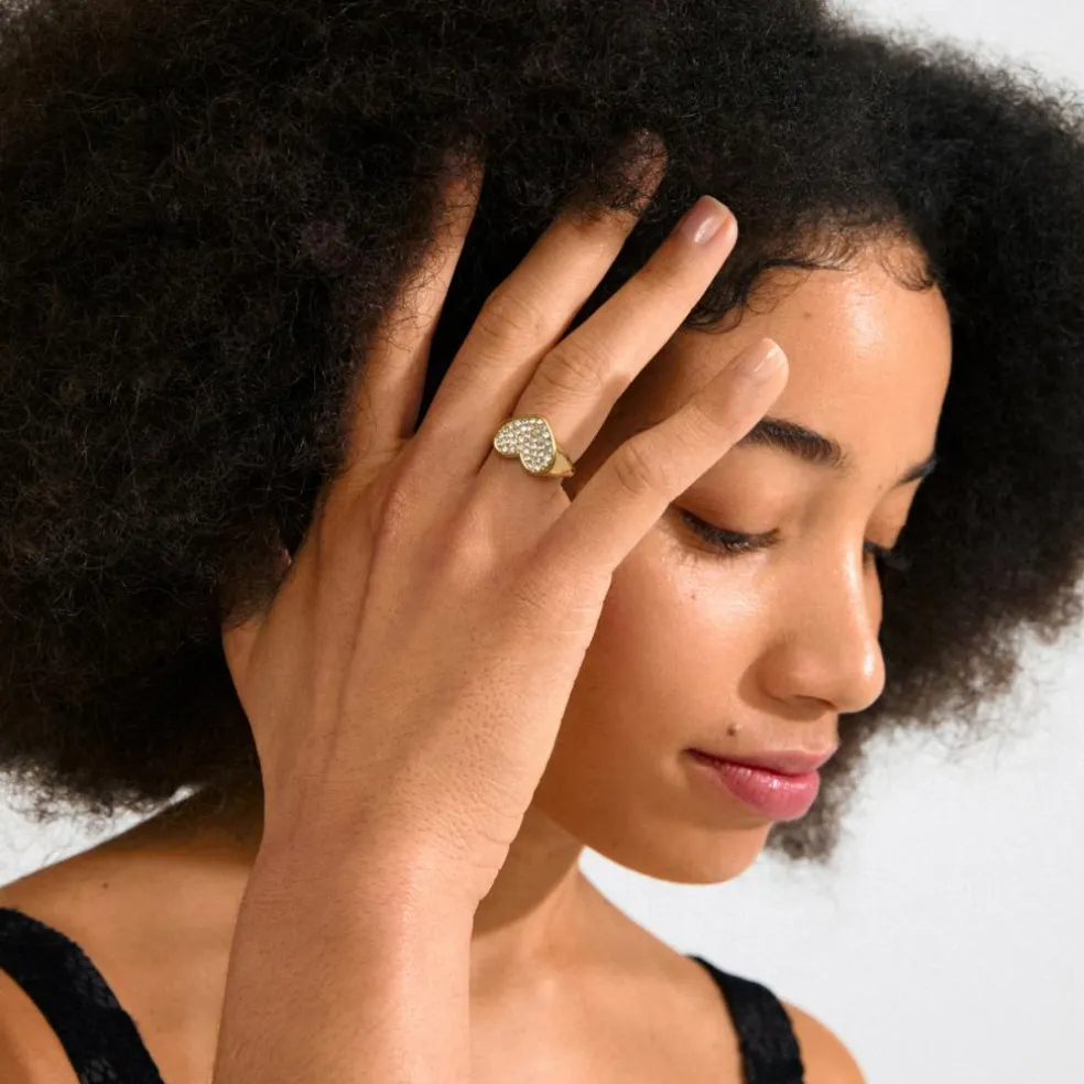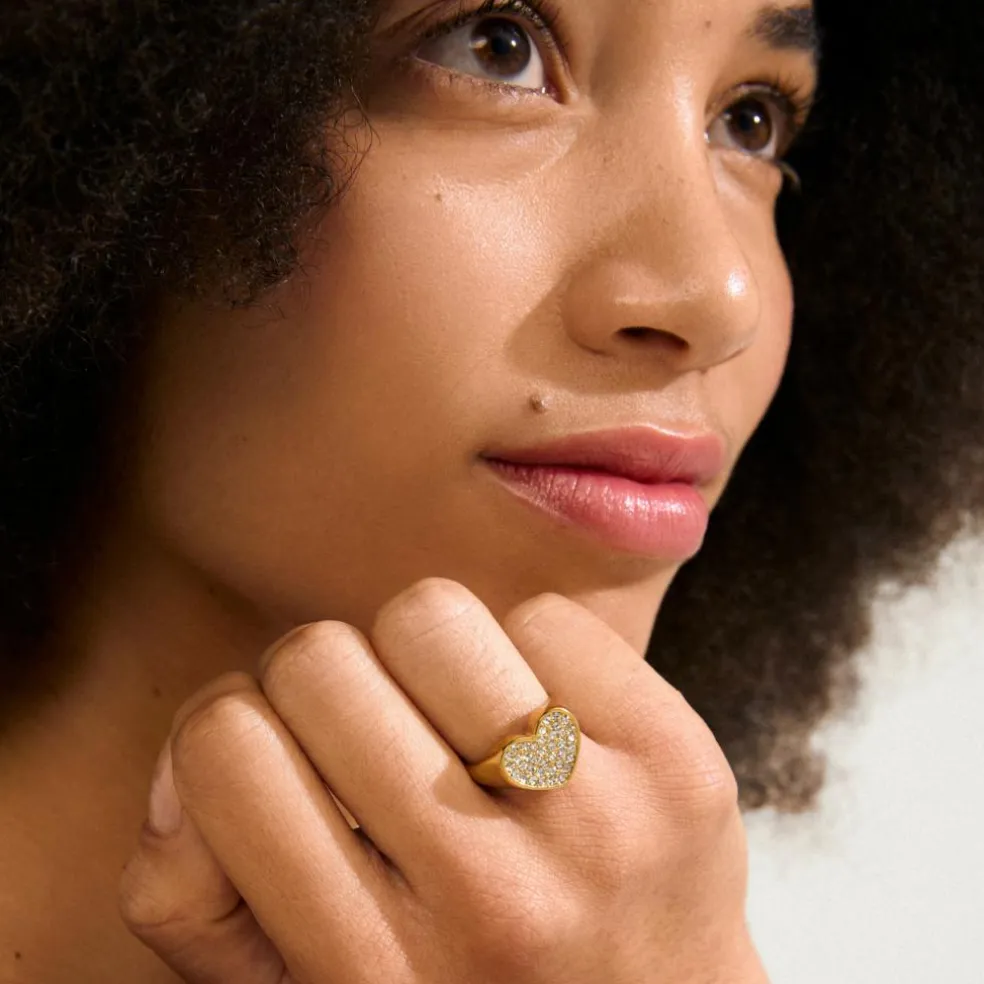 Guldbelagt ring med et stort hjerte fyldt med funklende Preciosa krystaller – en iøjnefaldende piece, der tilføjer max sparkle og romance til dit look.