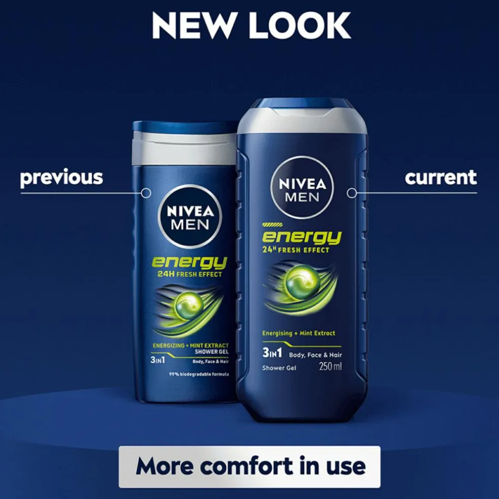 Formulaen er 99% bionedbrydelig* og fri for mikroplastik. Mærk energien fra NIVEA MEN Energy Shower Gel. *i henhold til OECD eller tilsvarende metoder.