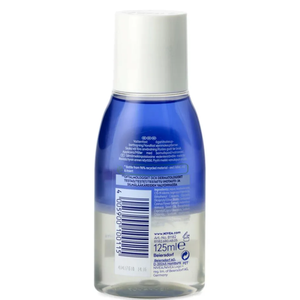 NIVEA Double Effect Eye Make-up Remover er en vandfast øjenmakeupfjerner, der fjerner selv ekstremt vandfast mascara og makeup uden at skulle gnide. Det følsomme øjenområde renses effektivt men skånsomt og øjenvipperne beskyttes. Makeupfjerneren er beriget med Biotin som styrker vipperne. Specielt formuleret med vitamin B7 og kornblomstekstrakt for ekstra pleje af det følsomme øjenområde og samtidig beskytte øjenvipperne. Den er velegnet til alle hudtyper, og er også velegnet til personer med kontaktlinser. Flasken er lavet af 96% genbrugsmateriale (ekskl. etiket & låg). NIVEA Double Effect Eye Make-up Remover er dermatologisk og oftalmologisk testet. Vegansk formel – fri for animalske ingredienser.