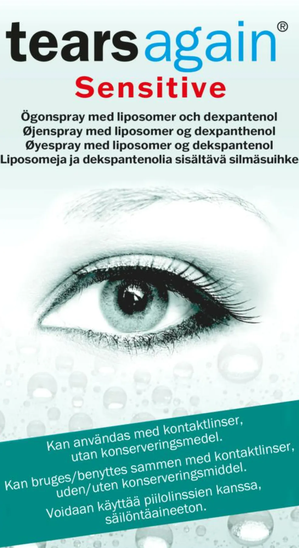 Tearsagain Sensitive er uden konserveringsmidler og med B5 vitamin, der plejer huden omkring øjnene.