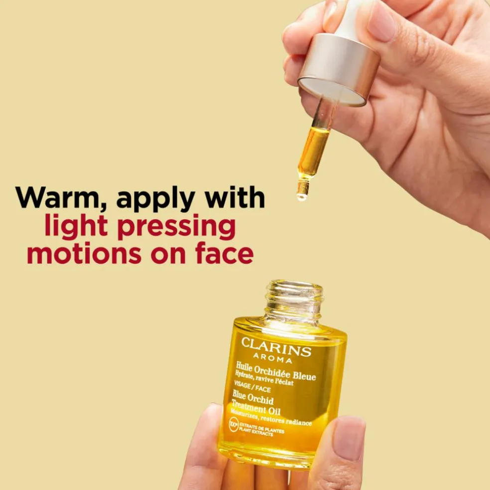 - Få dråber varmes op i håndfladerne og påføres med lette tryk på ansigt og hals hver aften.