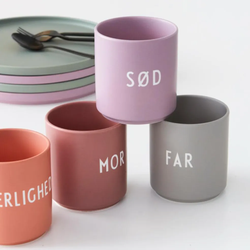 De superpopulære kopper i lækre farver, designet i den fineste ultra-mat glaserede porcelænskvalitet med skønne ord indgraveret på fronten.