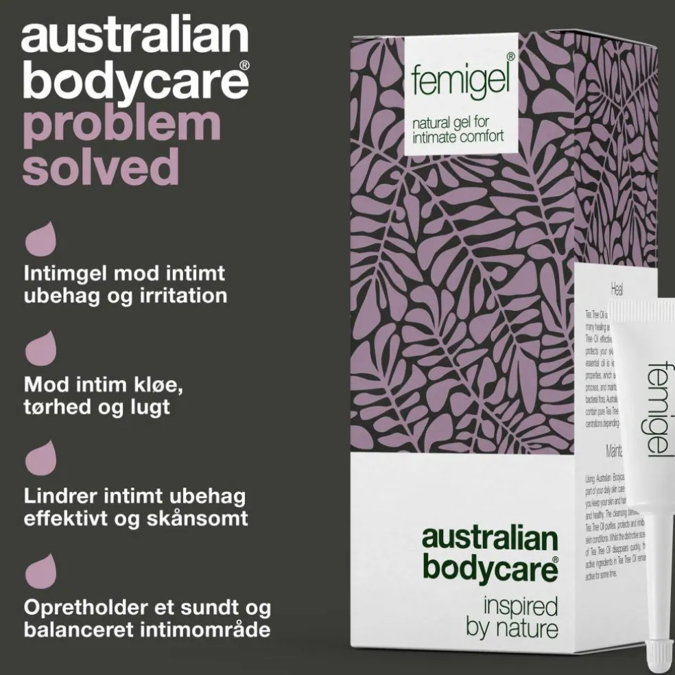 Femigel indeholder naturlig Tea Tree Oil, der modvirker de bakterier, der forårsager kløe, uønsket lugt og andre problemer i det intime område.