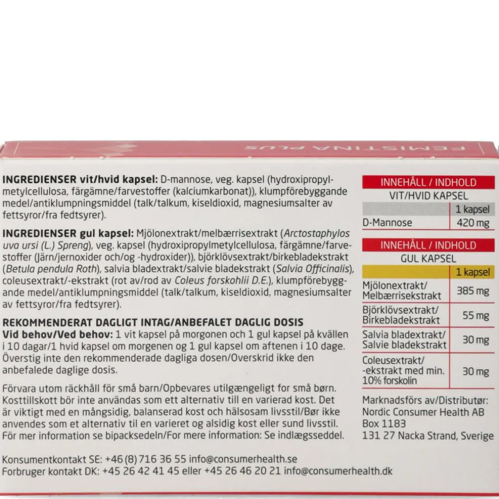 Femistina Plus indeholder udover birkebladsekstrakt også salvie, D-mannose og forskolin.