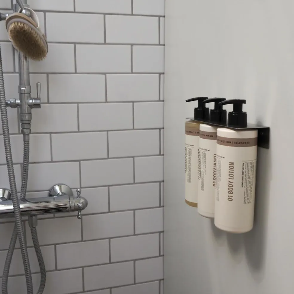 Praktisk og dekorativ ophæng til dine 500 ml shampoo, conditioner og body wash fra Humdakin. Perfekt til at lade dine produkter pynte i badet.