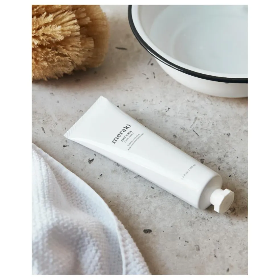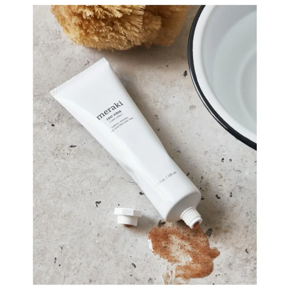 Forkæl dine fødder med denne certificeret økologiske Calm Cedar fodscrub fra Meraki. Skrubbekorn af økologiske abrikoskerner giver din hud en blid eksfoliering, mens økologisk solsikkeolie og olivenolie efterlader dine fødder bløde og velplejede, så du er klar til at vise dem frem i sandaler. Nyd eventuelt først et varmt fodbad for at blødgøre hård hud, og dup derefter med et håndklæde. Du kan også bruge scrubben på tørre fødder. Påfør en passende mængde og massér dine fødder og skinneben. Når du tilfører vand, bliver den gel-lignende scrub lind og mælkeagtig. Nu er dine fødder rene, velplejede og beriget med en forfriskende duft af eukalyptus, mynte og lime.