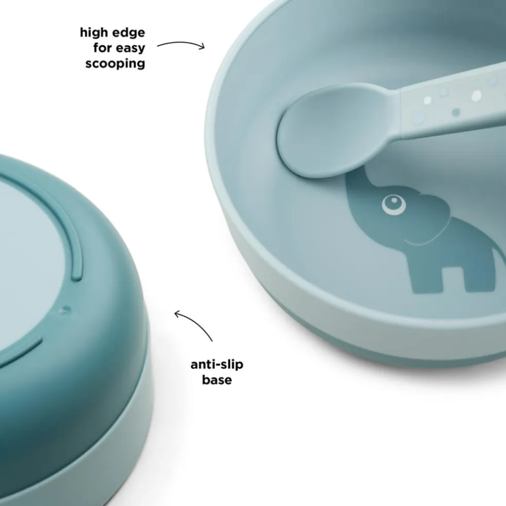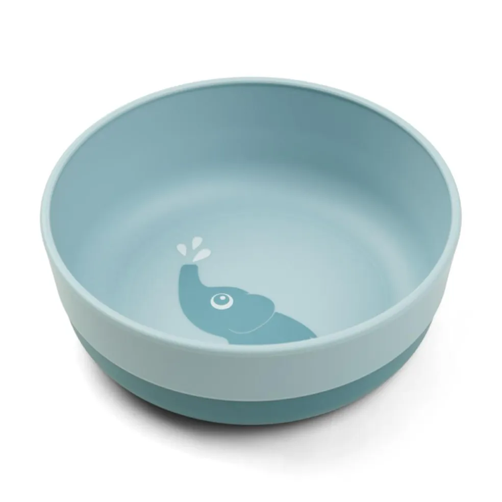 Den blå skål er dekoreret med et sødt motiv af den muntre elefant Elphee, der sprøjter med vand. Bundens mørkeblå farve skaber en fin, tofarvet detalje.