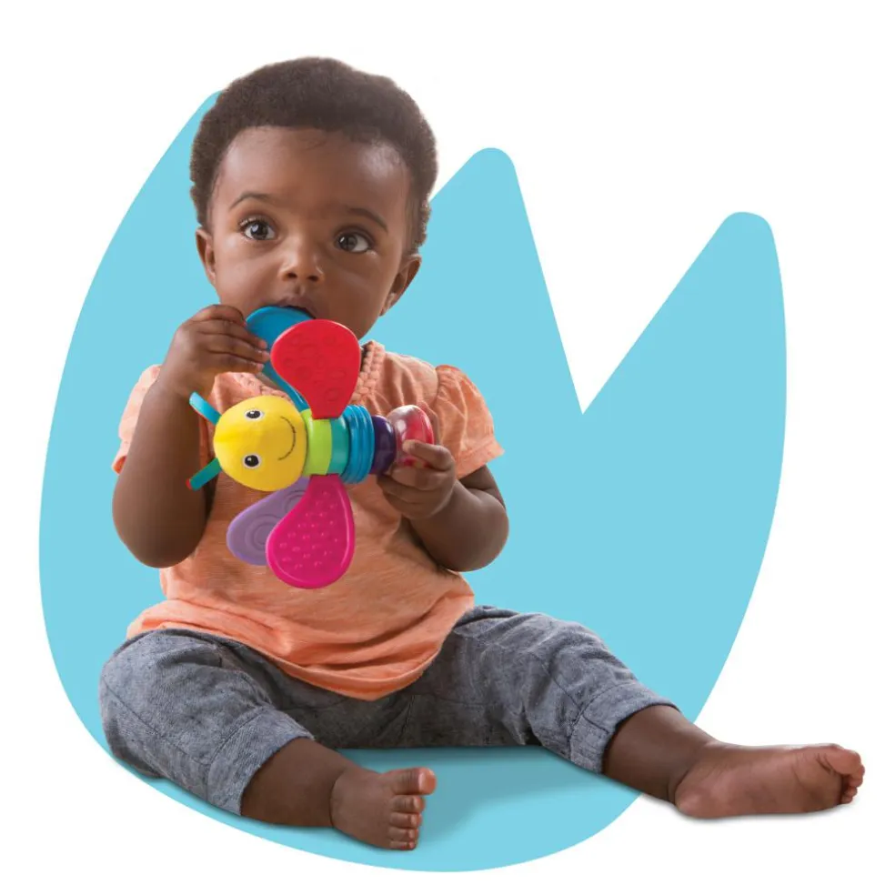 Freddies snurrende vinger er perfekte for babyer, der er ved at få tænder. Ryst ranglen langsomt, så baby kan følge de farverige perler, der bevæger sig inde i den gennemsigtige kapsel.