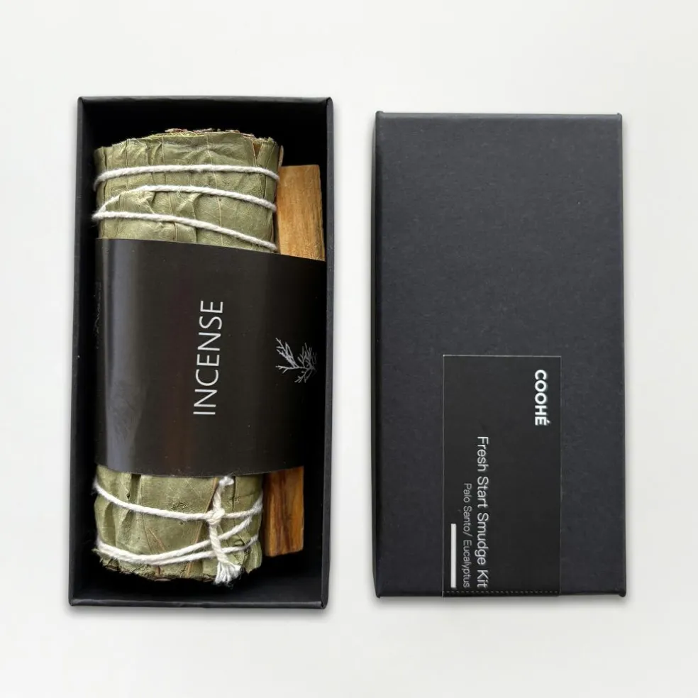 Tænd forsigtigt enden af eucalyptus-bundlen eller Palo Santo-sticken i ca. 20–30 sekunder, pust flammen ud, og lad den gløde, så rensende røg breder sig. Før røgen gennem rummet, omkring dig selv eller dine krystaller for at rense og genoplade. Husk altid at åbne et vindue for frisk luft og sikkerhed. Sluk gløden helt efter brug.