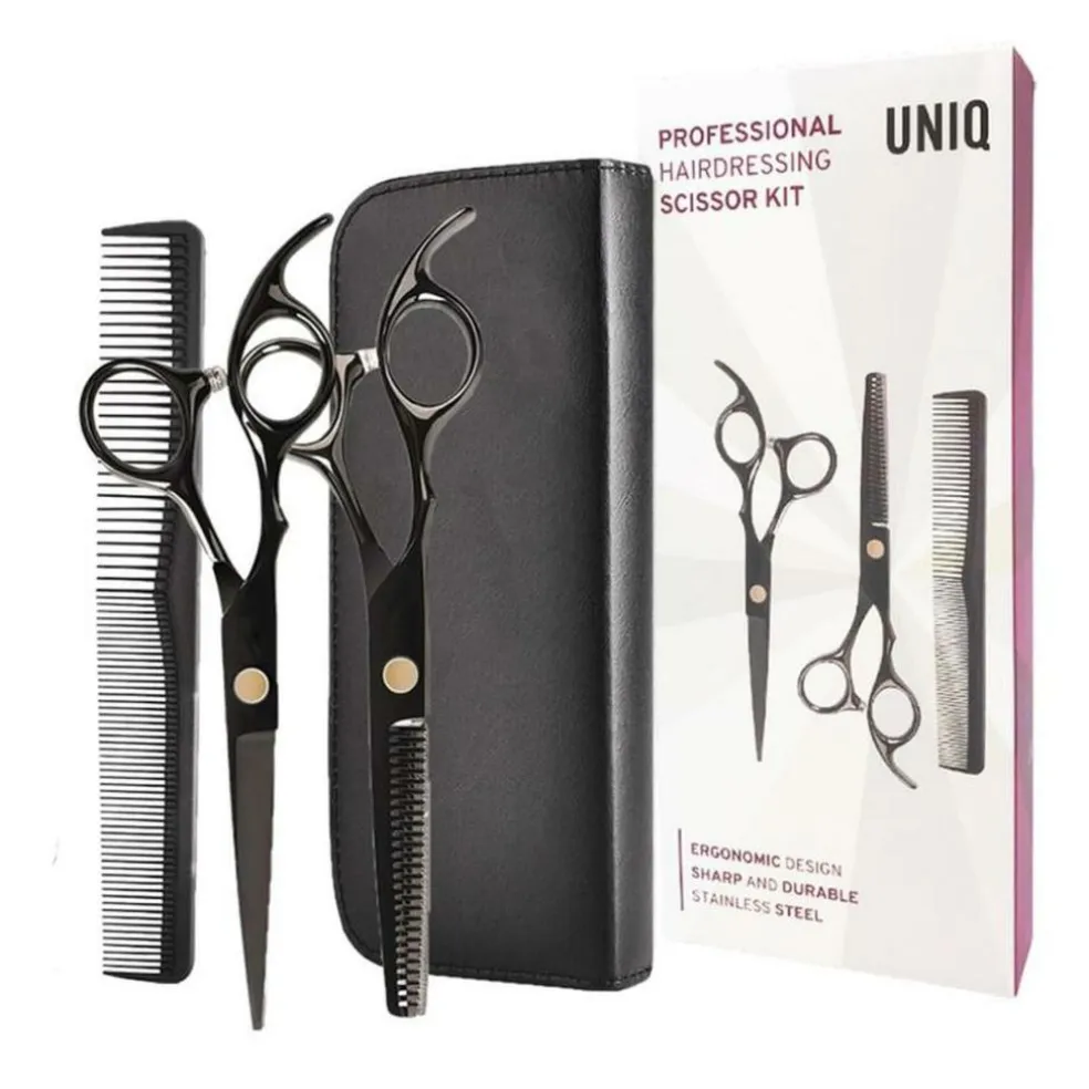 UNIQ Frisørsakse Sæt Sort: Opnå professionelle resultater derhjemme med dette UNIQ frisørsakse sæt i sort. Dette sæt indeholder alt, hvad du behøver for at klippe og style dit hår præcist og nemt. Sættet består af en frisørsaks, en fortynder saks (effilersaks) og en praktisk hårkam. Saksene er fremstillet af stål i høj kvalitet med specialslebet skær, hvilket sikrer en stabil og præcis klipning hver gang. Fingerskruerne giver et godt greb, så saksene ikke glider. Med det ergonomiske design ligger saksene godt i hånden, hvilket gør klipningen mere komfortabel. Det medfølgende opbevaringsetui beskytter dine sakse og gør dem nemme at transportere.