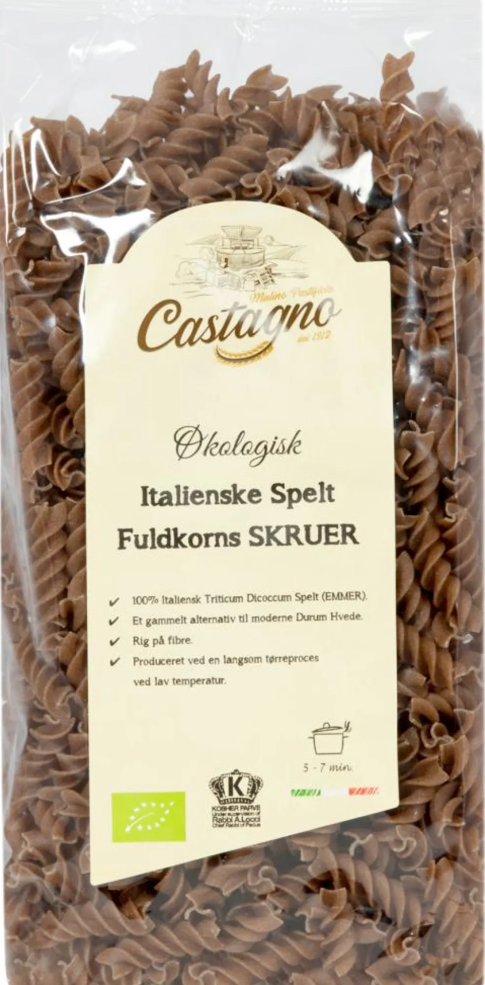 Castagno maler selv deres spelt på en unik måde for at få en 100% fuldkornsmel, derefter tilberedes det ved hjælp af en langsom tørringsproces ved lav temperatur, som gør det muligt at opretholde det meste af kornets egenskaber.