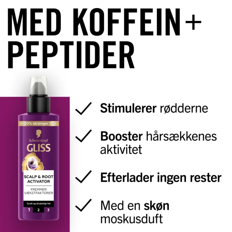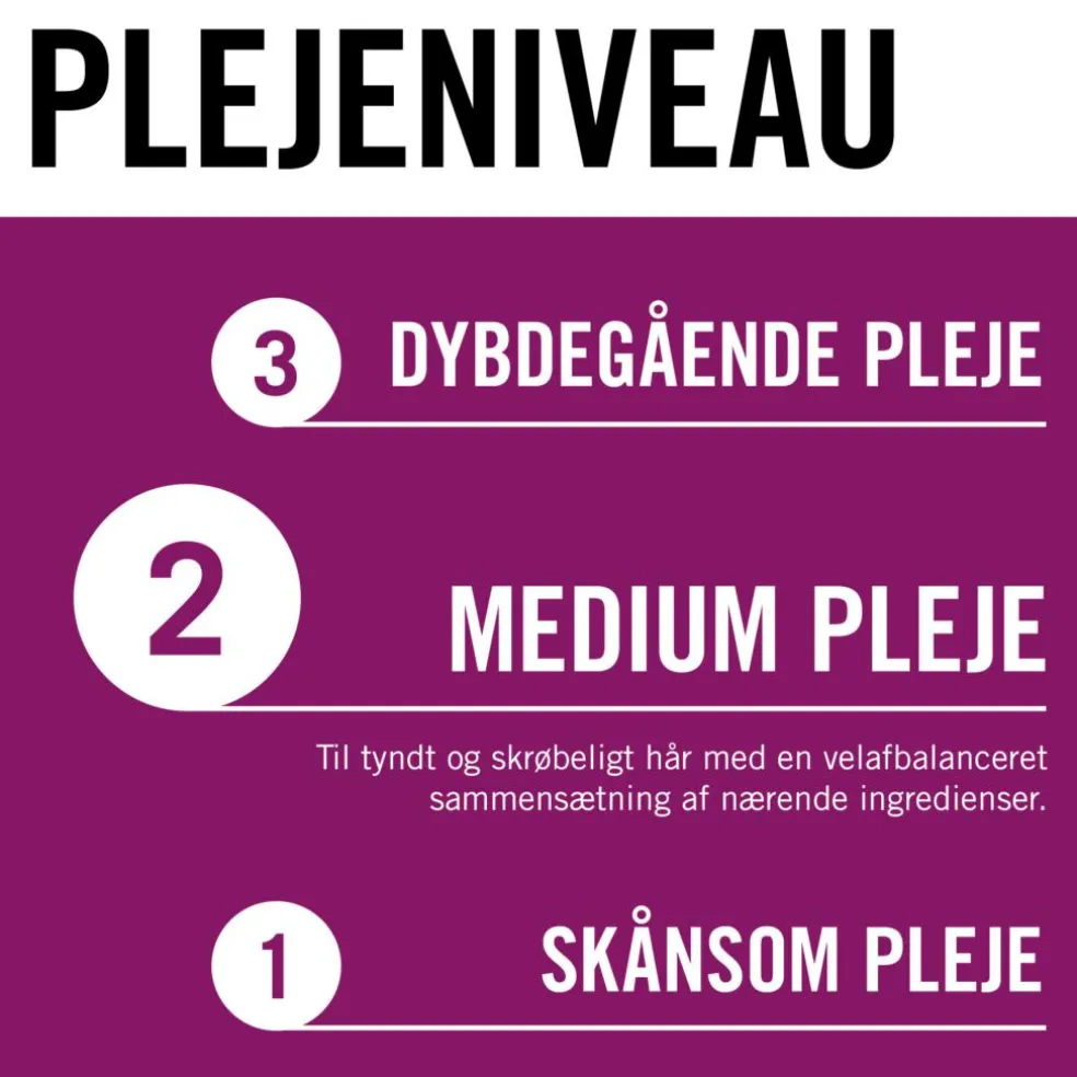 Gliss-plejeniveau: 2 – Medium pleje med en velafbalanceret sammensætning af nærende ingredienser. Dette Gliss-serum til tyndt og skrøbeligt hår stimulerer og styrker rødderne og booster hårsækkene uden at efterlade rester på håret eller puden.