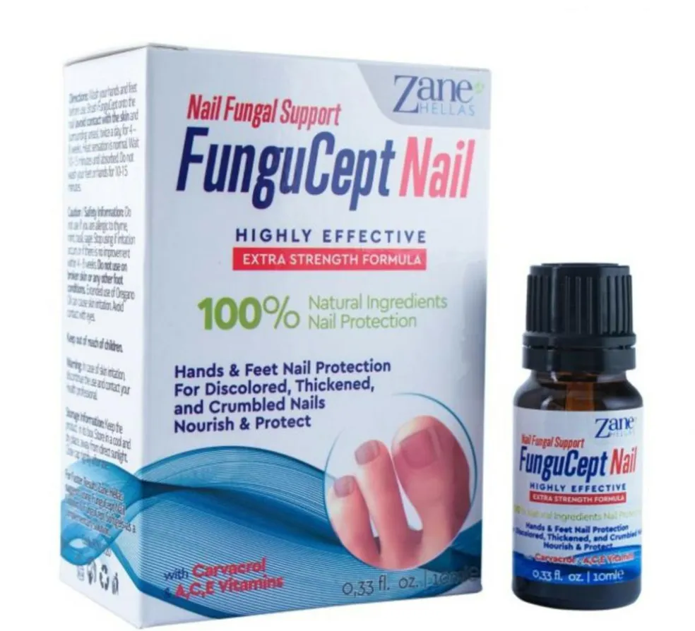 FunguCept Nail er baseret på naturlig oregano essentiel olie (Origanum Vulgare ssp. Hirtum – Heracleoticum) med naturligt indhold af carvacrol, som den vigtigste aktive ingrediens, samt tea tree olie, mandelolie (fra ægte mandler), økologisk calendula olie (morgenfrueolie), økologisk græsk extra jomfru olivenolie, eukalyptusolie, nellike æterisk olie, rosmarin æterisk olie, mynte æterisk olie med naturligt indhold af A, C, E vitaminer som næring til sunde negle.