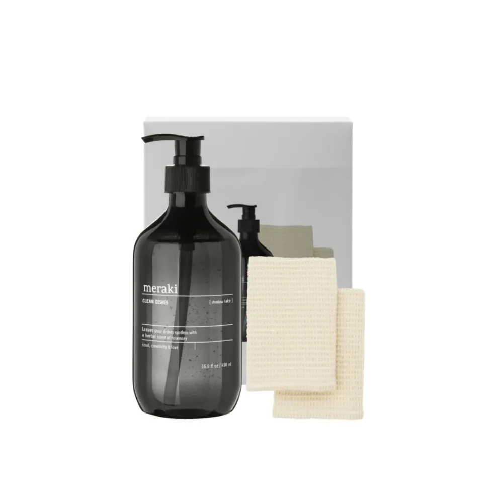 Et effektivt opvaskemiddel med friske noter af mandarin, rosmarin og blød moskus – og en blød, beige opvaskeklud, der lægger op til stil og hverdagsluksus i køkkenet.
