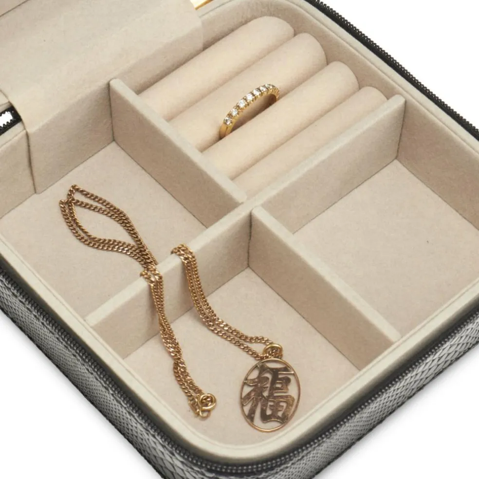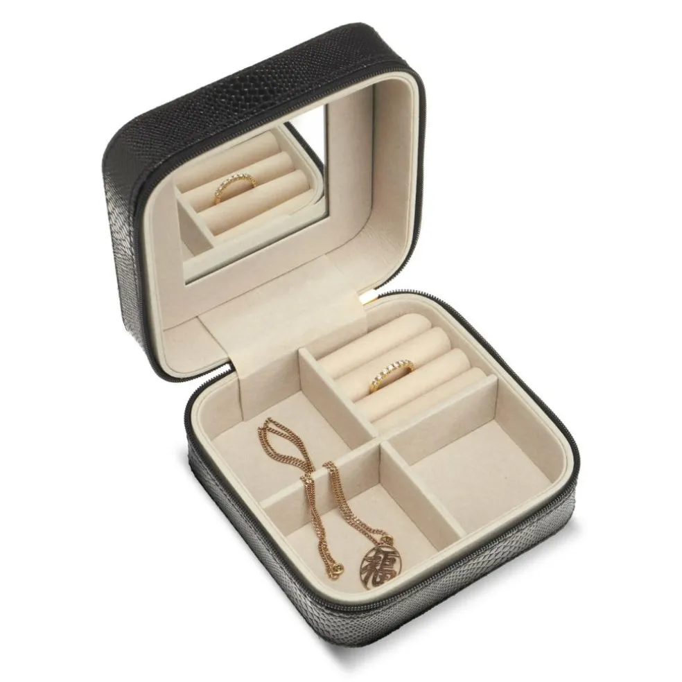 Gillian Jones smykkeskrin i sort vegansk snake-præget PU. Smart lille smykkeskrin med 3 rum, og plads til ringe og ørestikker. I låget er der et spejl. Smykkeskrinet lukkes med lynlås og en smart vedhængs-tassel, og har Gillian Jones logo i guld præget på toppen.