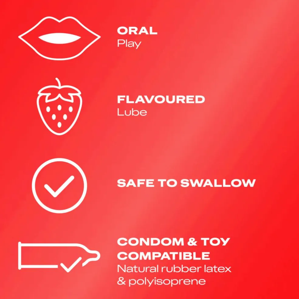 Frugtig glidecreme med jordbærsmag, der er sikker at sluge, smager godt og ikke klistrer eller efterlader pletter. Den er nem at bruge, nem at vaske af og efterlader ingen rester.