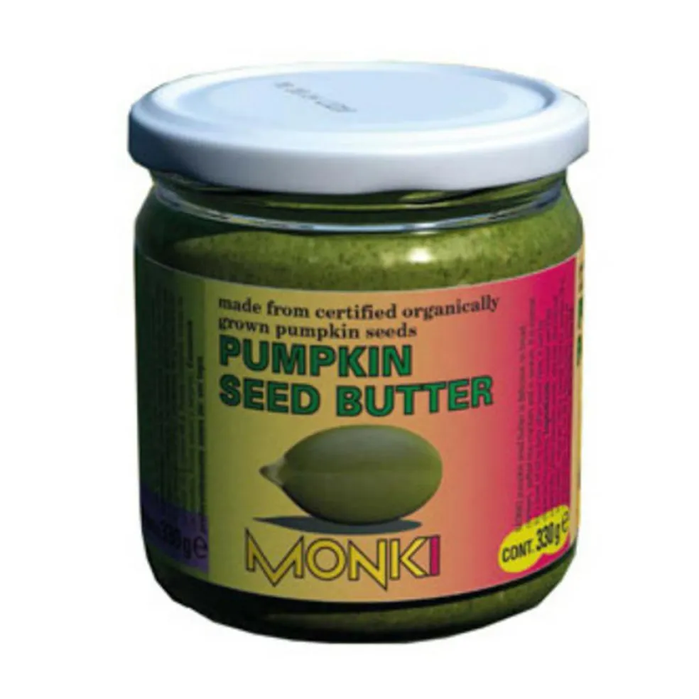 Det økologiske græskarkernesmør er lækkert på brød, kiks og riskiks. Det er normalt, at der dannes et lag af olie efter et stykke tid. Det blandes ved omrøring.