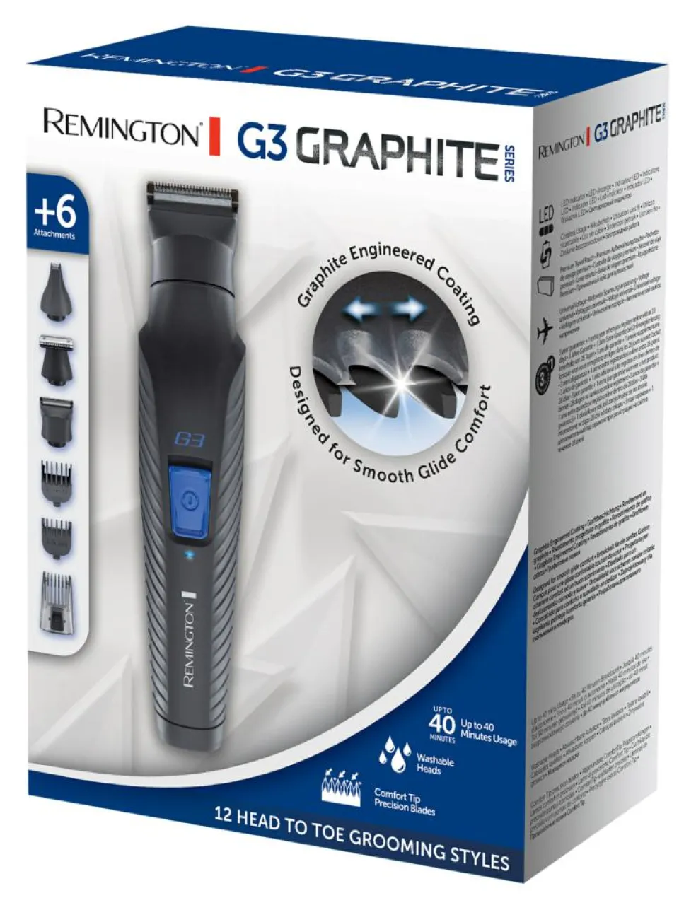 Graphite G3 giver dig frihed til at skabe din stil, der hvor du befinder dig. Maskinen er trådløs med 40 minutters driftstid, som giver dig masser af tid til din personlige pleje, så du kan skabe dit helt eget look. Hvad enten du trimmer, barberer, groomer eller styler, er Graphite G3 den ideelle alt-i-en løsning til personlig pleje, så du kan skabe din helt egen stil.