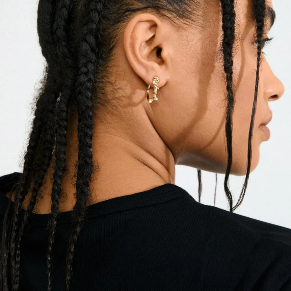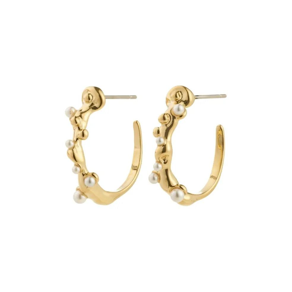 De guldbelagte HADLEY semi hoops fra Pilgrim kommer i et sødt organisk design, hvor små bobler og perlemorsfarvede glasperler fanger essensen af dugdråber i den tidlige morgen.