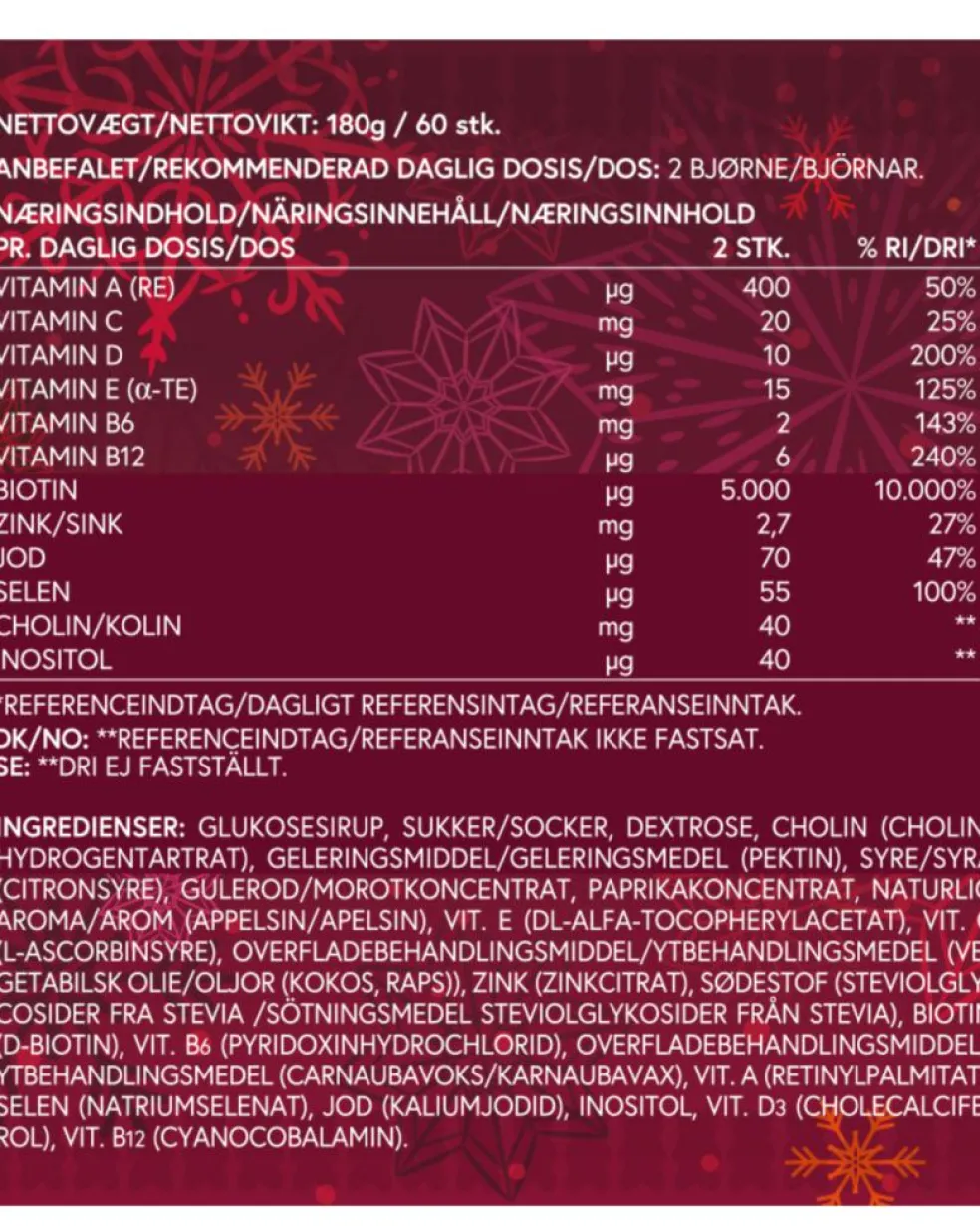 Både biotin og selen er velkendte ingredienser, når man ønsker smukt hår og flotte negle, og ligesom de andre smagsvarianter indeholder VitaYummy Hair & Nails Christmas Edition 5.000 µg biotin og 55 µg selen. Biotin og selen bidrager til at vedligeholde et normalt hår, og derudover bidrager selen til at vedligeholde normale negle og til at beskytte cellerne mod oxidativt stress.