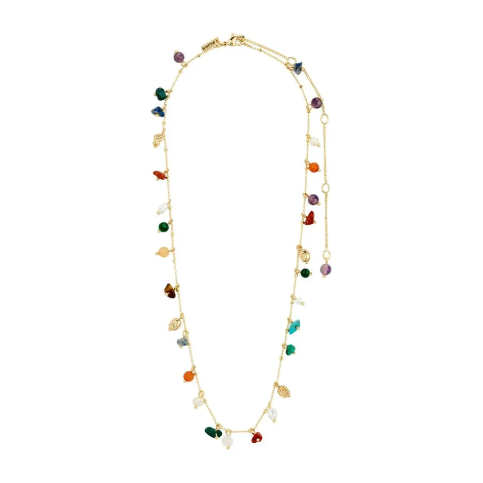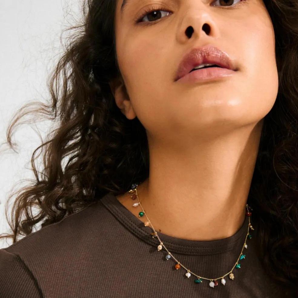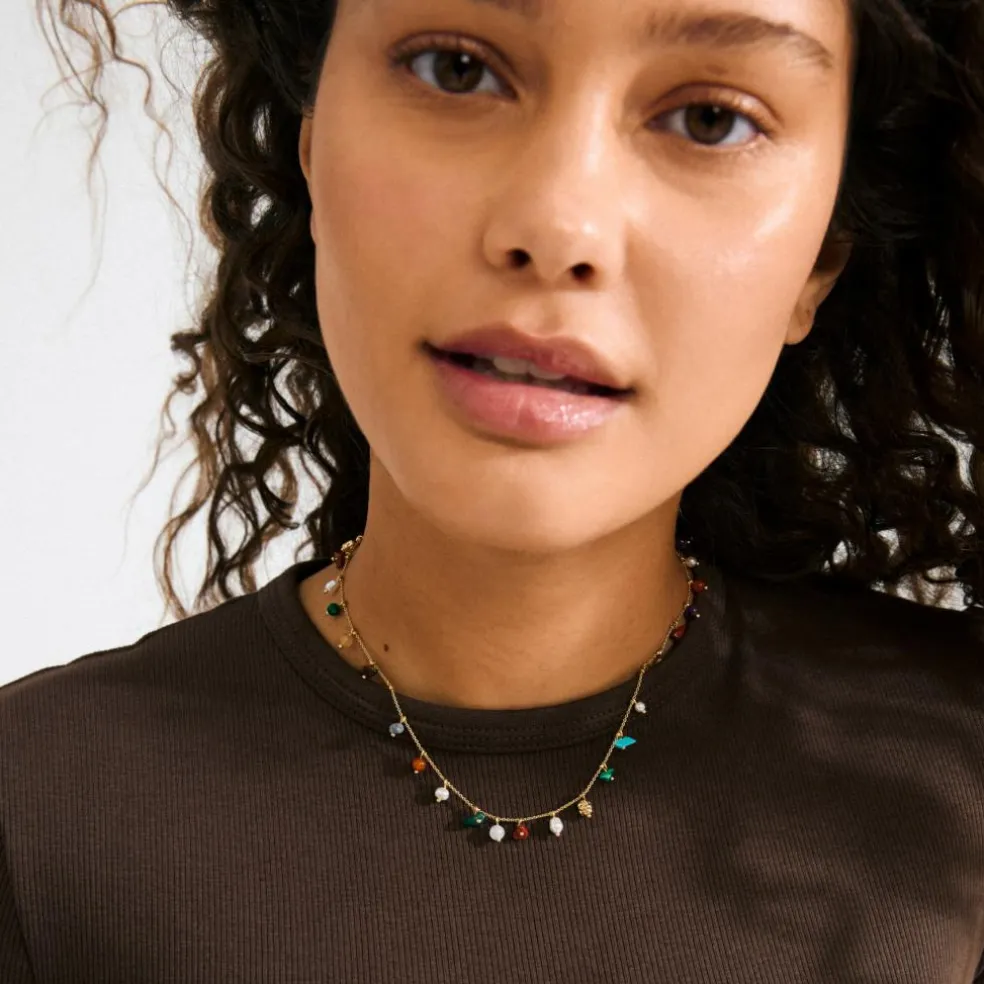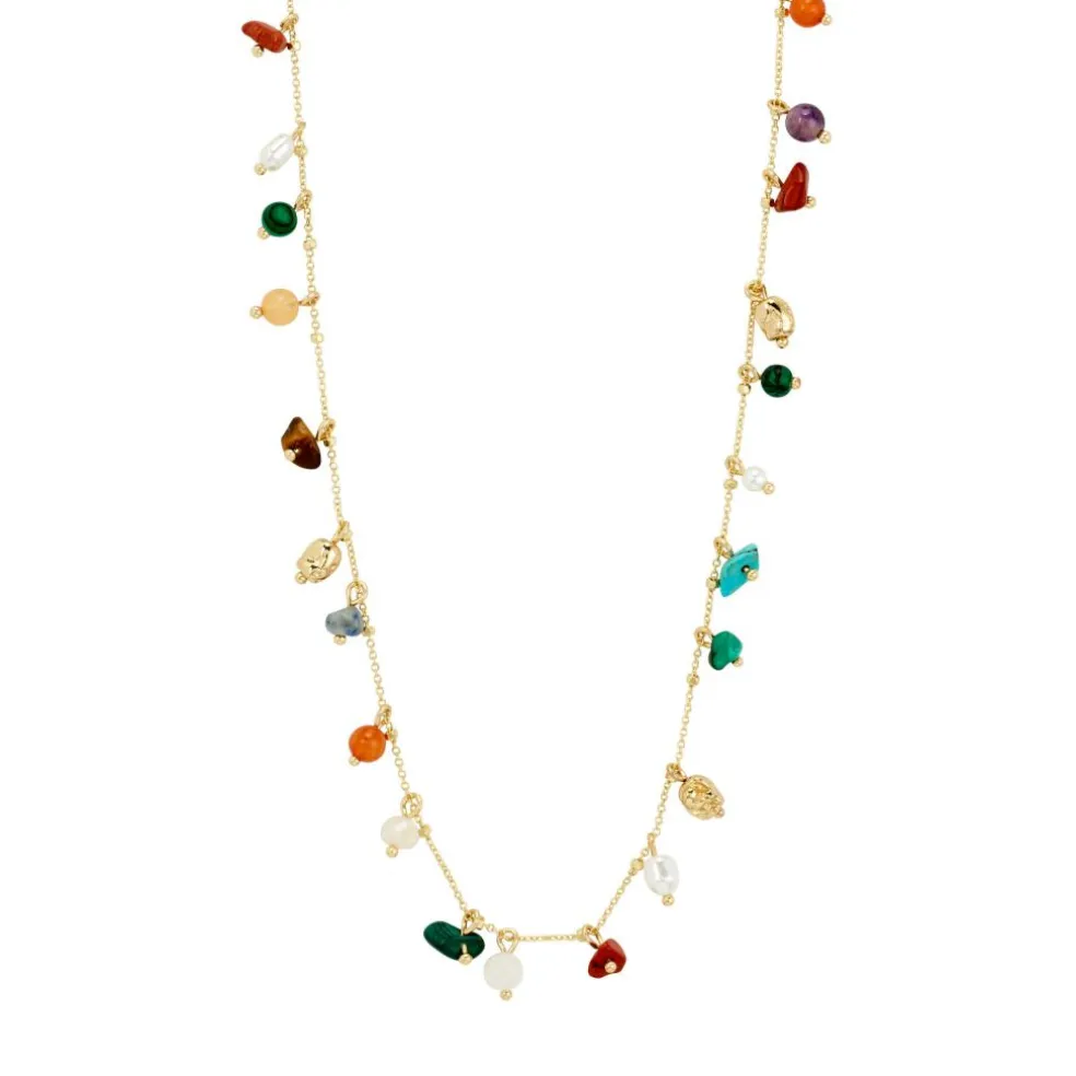 Farverige halvædelsten som bl.a. Ametyst, Malachite, Aventurine, Turkis, Quartz og Tiger Eye skaber en vibrant, grounded vibe, – et musthave til dig, der elsker personlighed i dit style game.