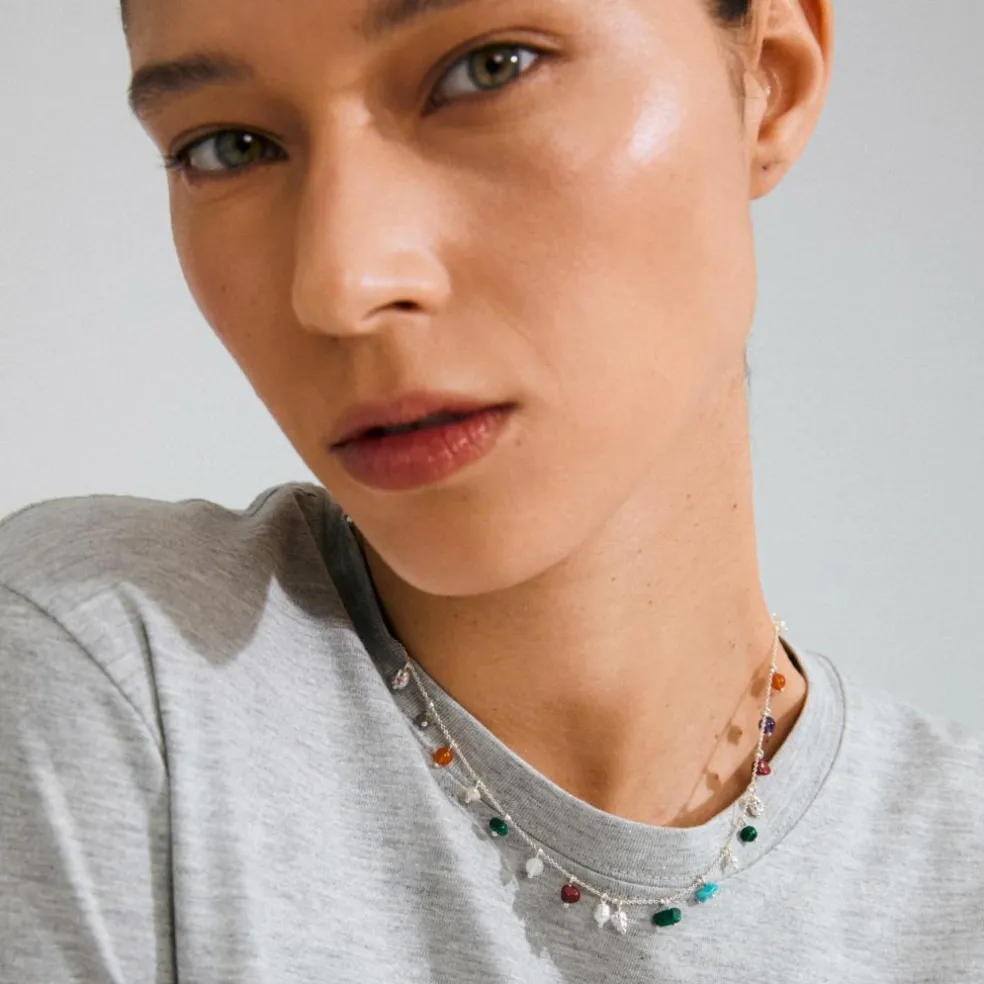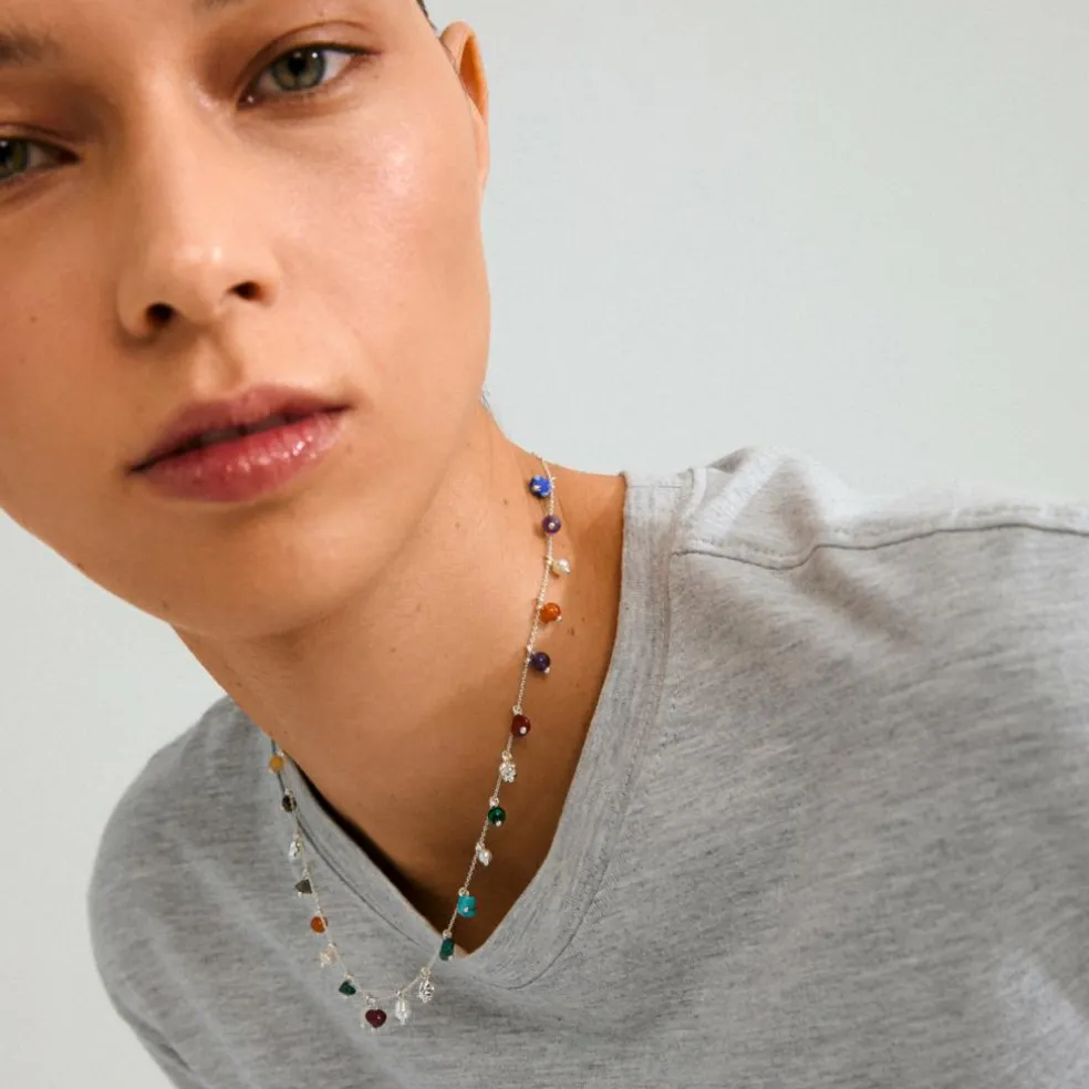 Farverige halvædelsten som bl.a. Ametyst, Malachite, Aventurine, Turkis, Quartz og Tiger Eye skaber en vibrant, grounded vibe, – et musthave til dig, der elsker personlighed i dit style game.