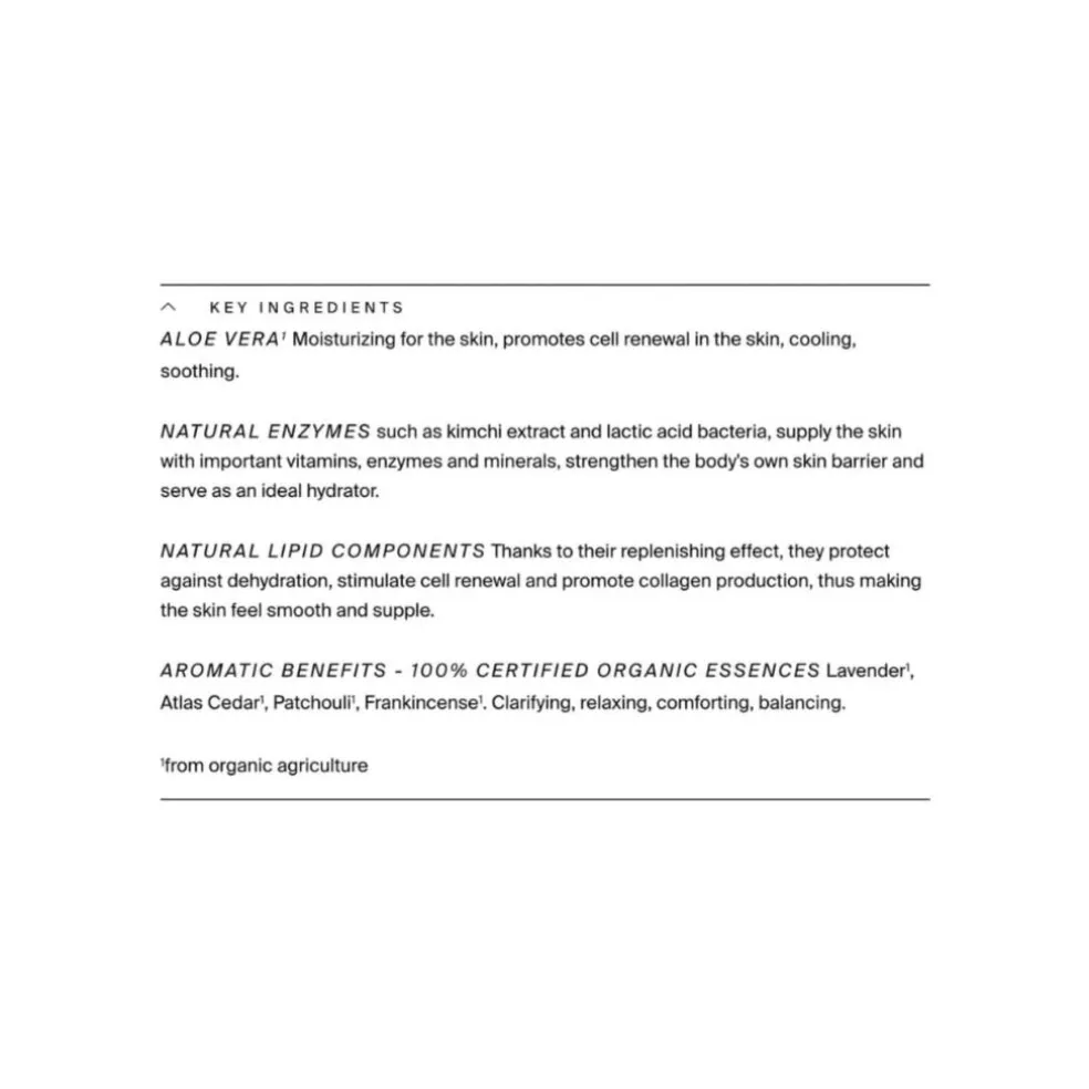 Aqua, Aloe Barbadensis Leaf Juice1, Sodium Coco-Sulfate, Glycerin2, Cocoyl Methyl Glucamide, Lauryl Glucoside, Cedrus Atlantica Bark Oil1, Lavandula Angustifolia Oil1, Pogostemon Cablin Leaf Oil1, Boswellia Carterii Oil1, Parfum1 (100 % organic essential oils incl. Linalool, Geraniol, Citronellol), Leuconostoc/ Radish Root Ferment Filtrate, Lactobacillus Ferment, Glyceryl Oleate, Coco-Glucoside, Sodium Levulinate, Sodium Anisate, Sodium Chloride, Citric Acid, Arginine. 1from organic agriculture 2made using organic ingredients