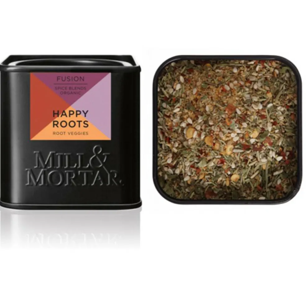 Happy roots er en økologisk krydderiblanding som Mill & Mortar har udviklet. Den består af en økologisk urteblanding med 5 forskellige urter, som er sat sammen med chili og sesam. Du kan bruge den til krydring af alle slags rodfrugter, ligesom du kan anvende blandingen i mos, rösti, på rodfrugtbøffer eller som krydderi på pommes frites.