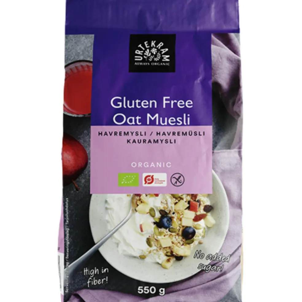 Urtekrams glutenfri havremysli med frugt er et økologisk produkt, der er kilde til fibre. Myslien indeholder blandt andet majsfuldkornsflager rosiner, græskarkerner, hel boghvede og tørrede æbletern. Top gerne med lidt ekstra frisk frugt.
